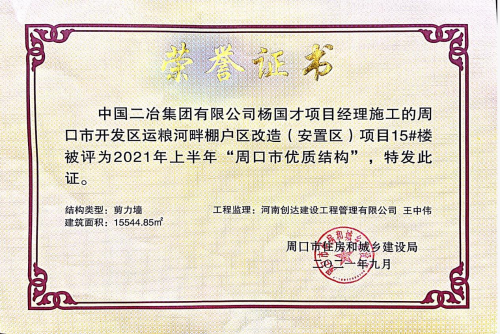 10月14日,由中国二冶新型建筑分公司承建施工的周口市运粮河畔棚户区改造(安置区)项目15#楼被评为2021年上半年“周口市优质结构”工程奖。