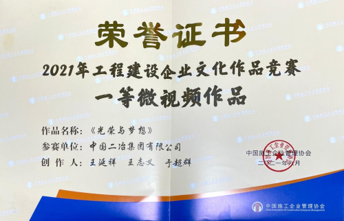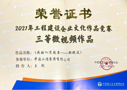 会上公布了2021年工程建设企业文化作品竞赛活动评选结果及2021年度优秀通讯员名单。中国二冶官网荣获工程建设企业文化作品竞赛优秀网站;公司党群工作部王延祥、王志义、于超群主创的《光荣与梦想》荣获微视频作品类一等奖;路桥分公司王琛主创的《我的入党故事——郝艳波》荣获微视频作品类三等奖;公司党群工作部张婷荣获2021年度优秀通讯员。