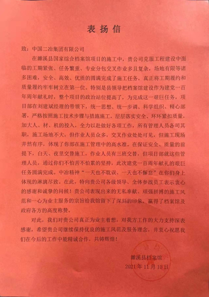 11月10日,濉溪县档案馆致中国二冶表扬信,对中国二在濉溪国家档案馆EPC总承包项目建设中,克服工程建设工期紧张、任务繁重、专业交叉作业多、场地有限等诸多困难,安全、优质、高效地圆满完成施工任务给予表扬。