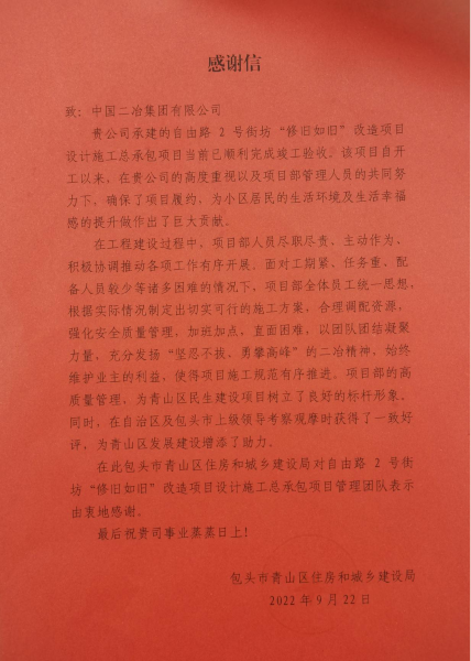 感谢信指出,自由路 2 号街坊“修旧如旧”改造项目设计施工总承包项目实施过程中,中国二冶领导高度重视并给予决策指导,项目部管理人员努力付出,积极配合工作,保质保量完成工期履约,为小区居民生活环境及生活幸福感的提升做作出了巨大贡献。