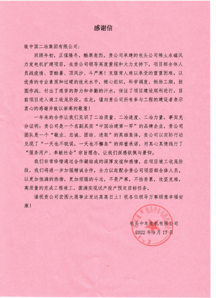 9月26日,包头中车电机有限公司向中国二冶致表扬信,表扬中国二冶战疫情、冒酷暑、顶风沙、斗严寒,克服重重苦难,保证项目建设顺利进行的央企作为,对中国二冶承建的包头中车项目顺利完成各项工程节点和任务目标表示认可。