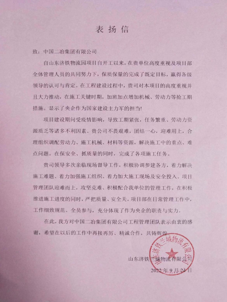 9月29日,山东济铁兰城物流有限公司向中国二冶致表扬信,表扬中国二冶团结一心、迎难而上,在施工关键节点,加班加点抢工期,克服重重困难,保质保量完成既定目标,充分展示出央企作为国家建设主力军的担当作为。