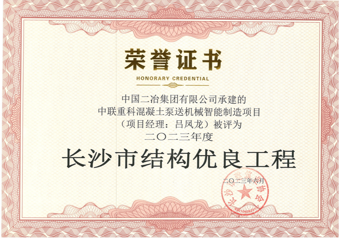 7月26日,长沙市建筑业协会发布“长沙市结构优良工程”评选结果公告,由中国二冶承建的中联重科混凝土泵送机械智能制造项目荣获2023年度“长沙市结构优良工程”荣誉。