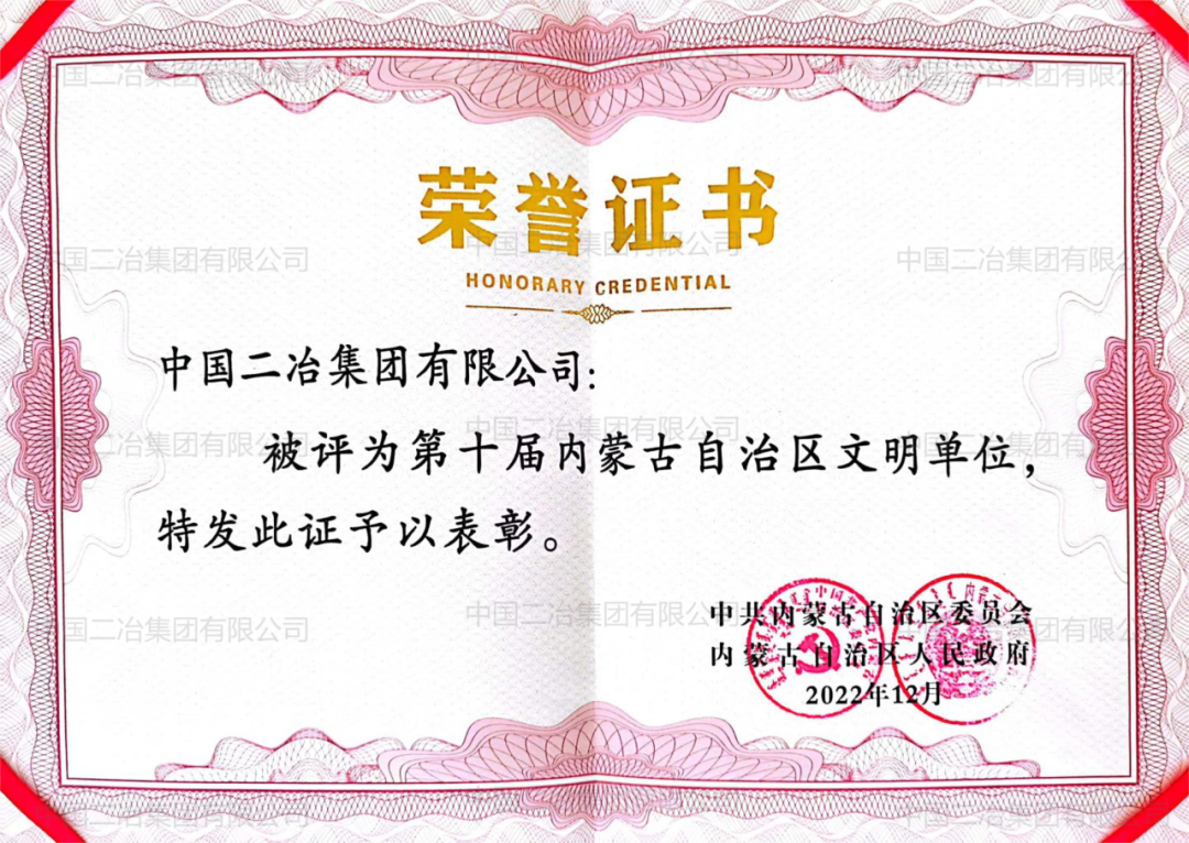 2023年,中国二冶顺利通过内蒙古自治区文明单位审核,7月收到由中共内蒙古自治区委员会、内蒙古自治区人民政府颁发的“内蒙古自治区文明单位”奖牌和证书。这是中国二冶精神文明建设的一枚勋章,也为企业高质量健康发展再添不竭动力。