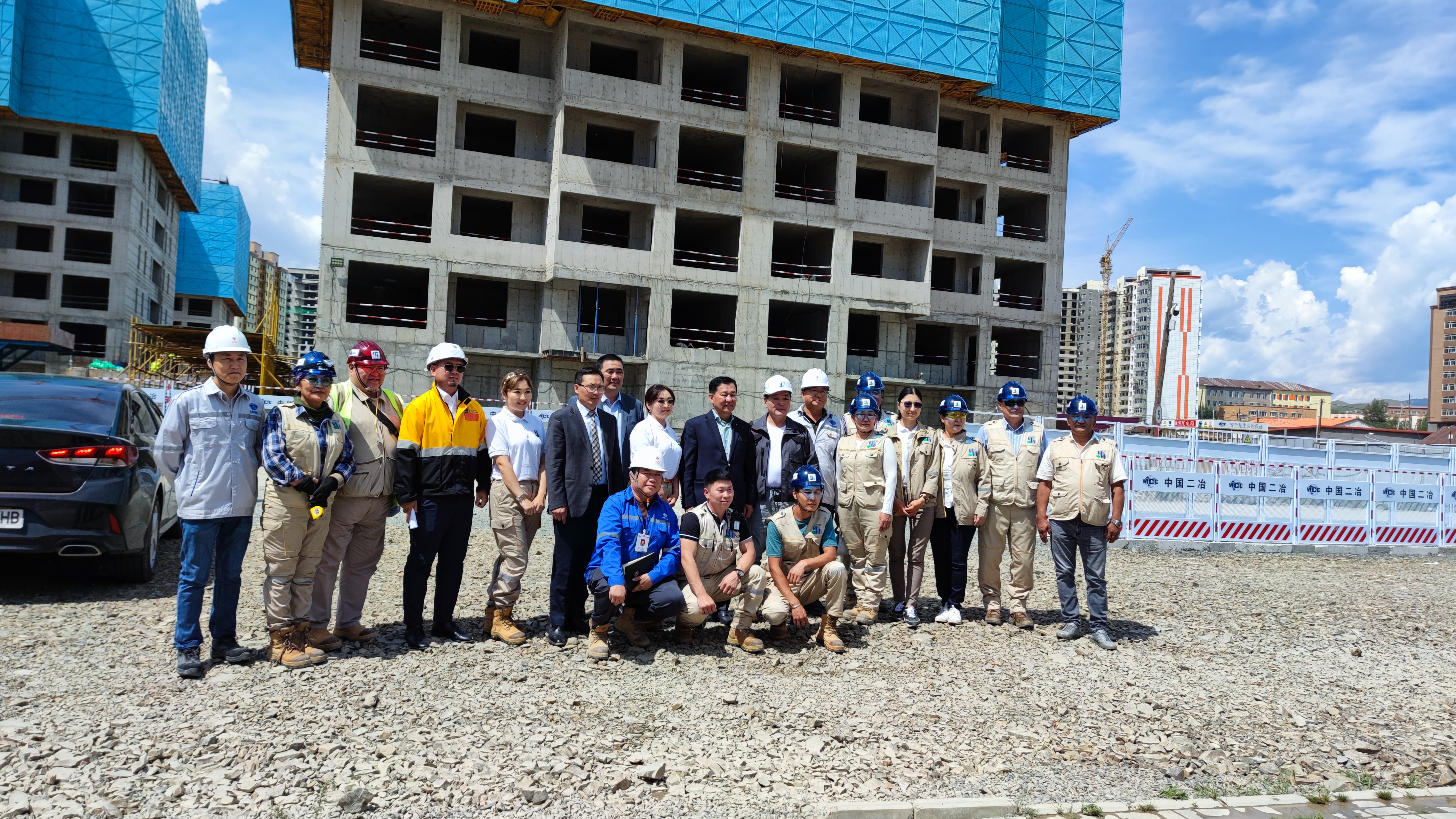 7月27日,蒙古国建设部部长策·达瓦苏荣一行到中华人民共和国援建、中国二冶承建的蒙古国棚户区改造项目检查指导工作并提出要求。
