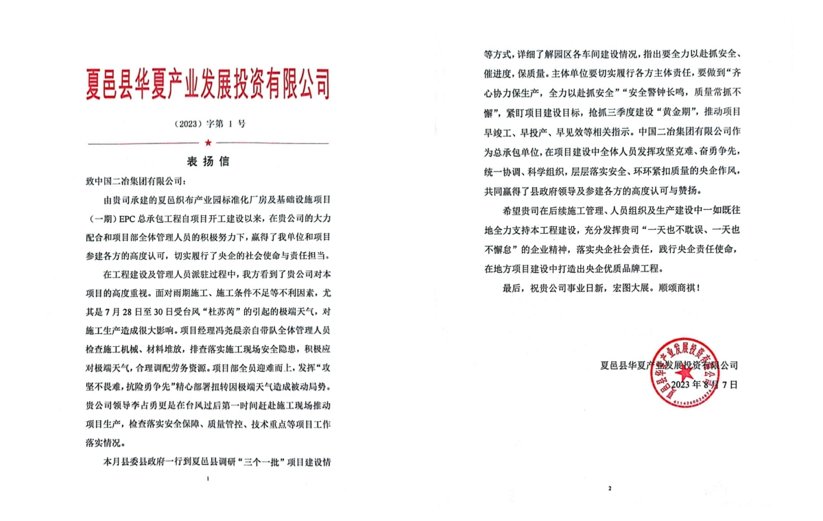 8月9日,中国二冶收到夏邑县华夏产业发展投资公司表扬信,对中国二冶承建的夏邑织布产业园标准化厂房及基础设施项目中展现的责任与担当表示赞许与感谢。