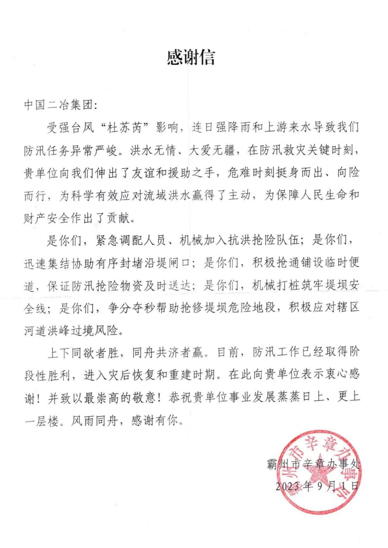 这封感谢信是对中国二冶在防汛救灾关键时刻挺身而出的充分肯定,在接下来的工作中,中国二冶将继续履行央企社会责任,坚持人民至上、生命至上,以爱心践初心,用实际行动筑牢守护人民群众生命财产安全的坚固防线,为保障人民群众生命财产安全和经济社会健康发展贡献二冶力量!