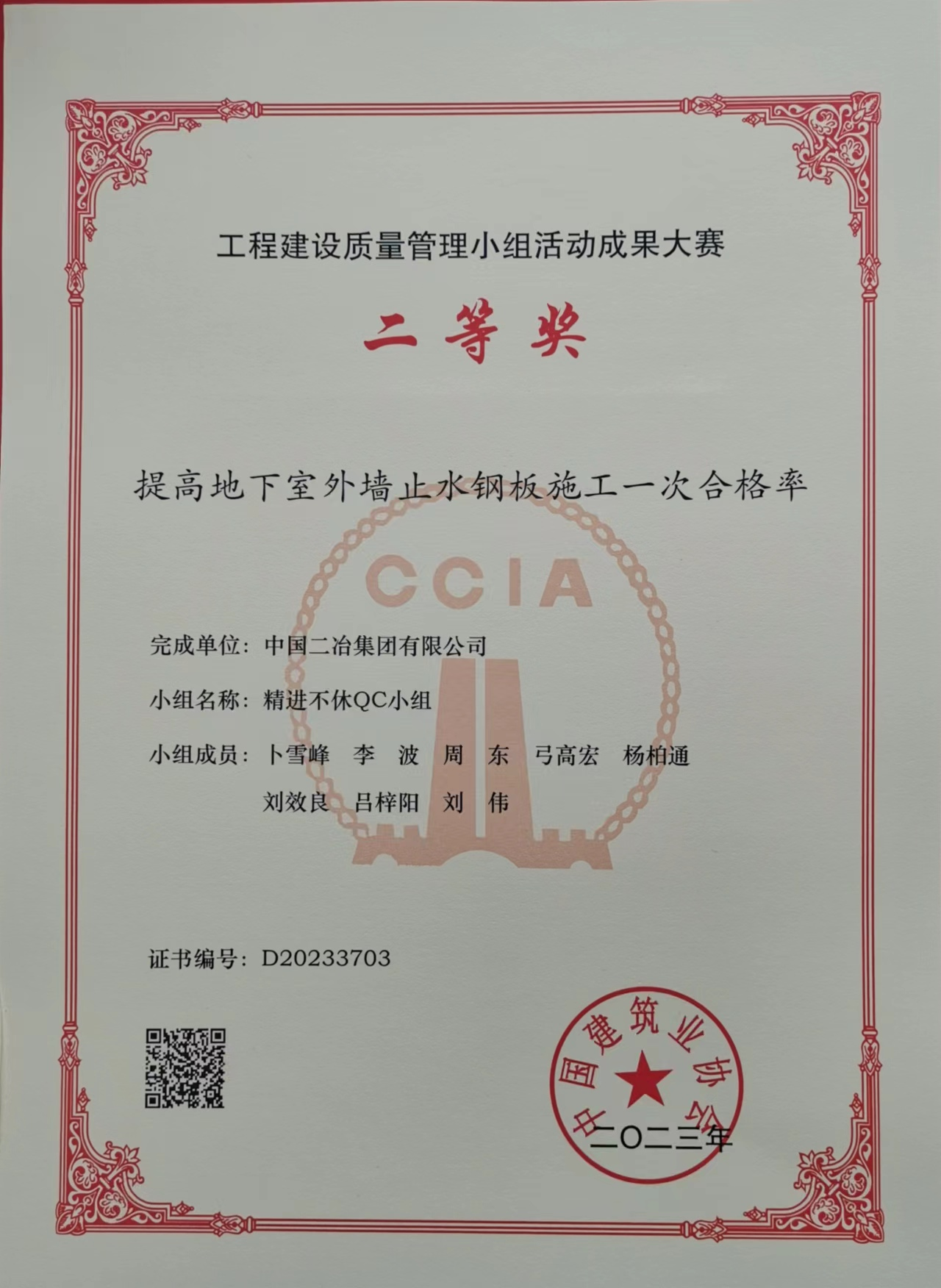9月25日,中国二冶《提高地下室止水钢板施工一次合格率》QC成果在中国建筑业协会举办的工程建设质量管理小组活动成果大赛中荣获二等奖。
