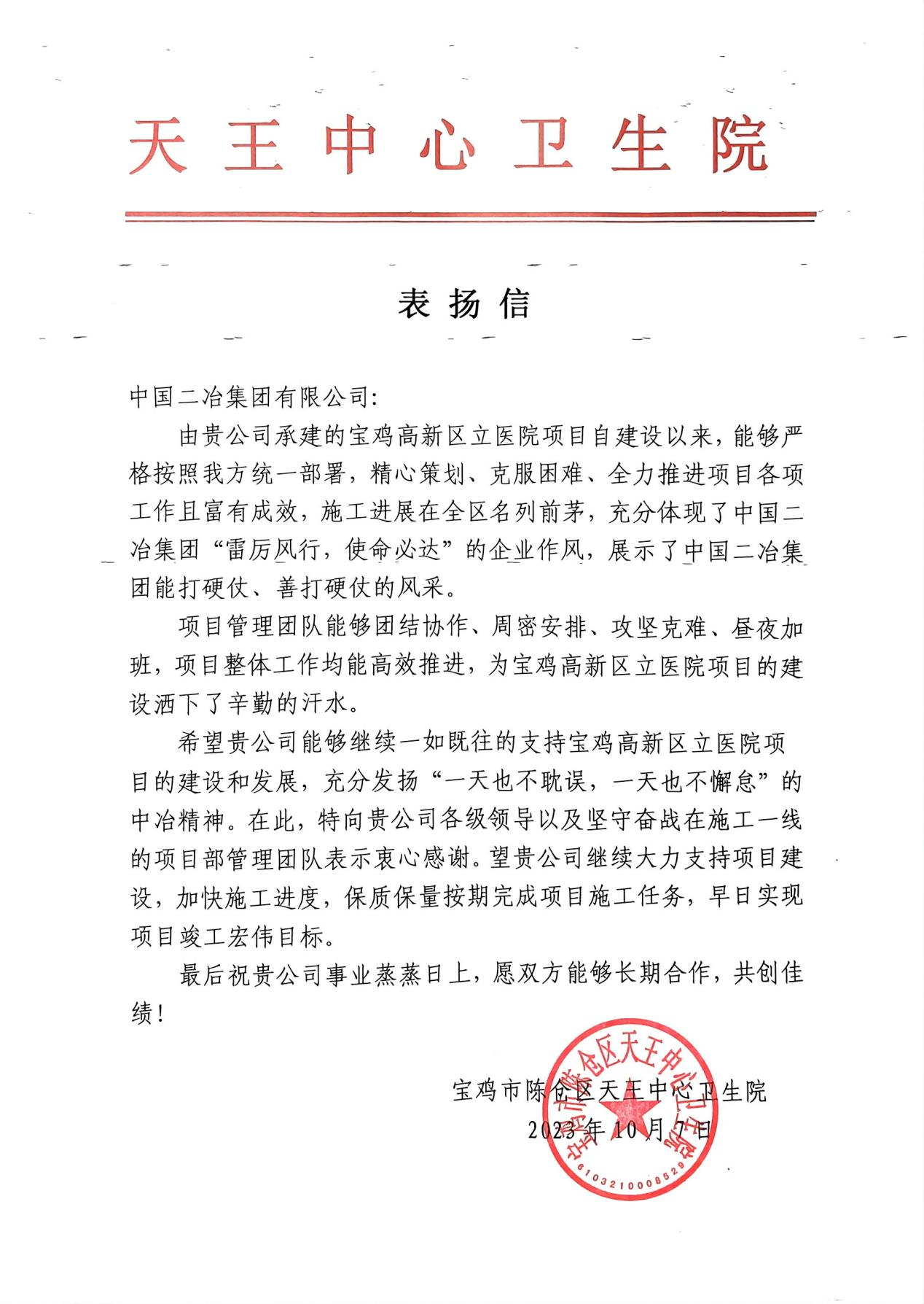 10月7日,中国二冶收到宝鸡市陈仓区天王中心卫生院发来的表扬信,对中国二冶高质量完成宝鸡高新区立医院项目封顶目标表示肯定和赞扬。