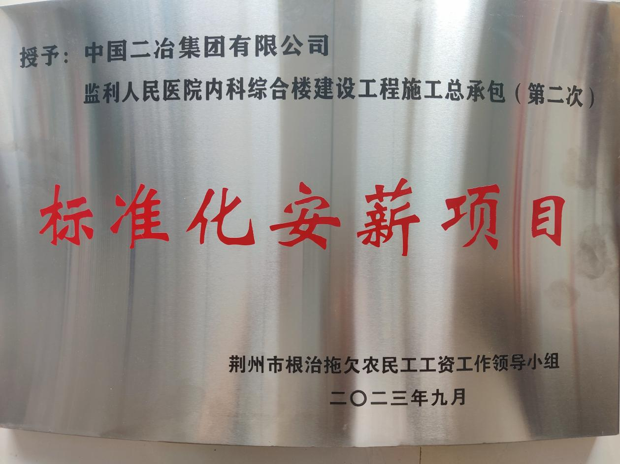 10月10日,中国二冶监利市人民医院项目在荆州市建筑行业安全生产标准化工作推进会上,被荆州市根治拖欠农民工工资工作领导小组授予“标准化安薪项目”荣誉称号。