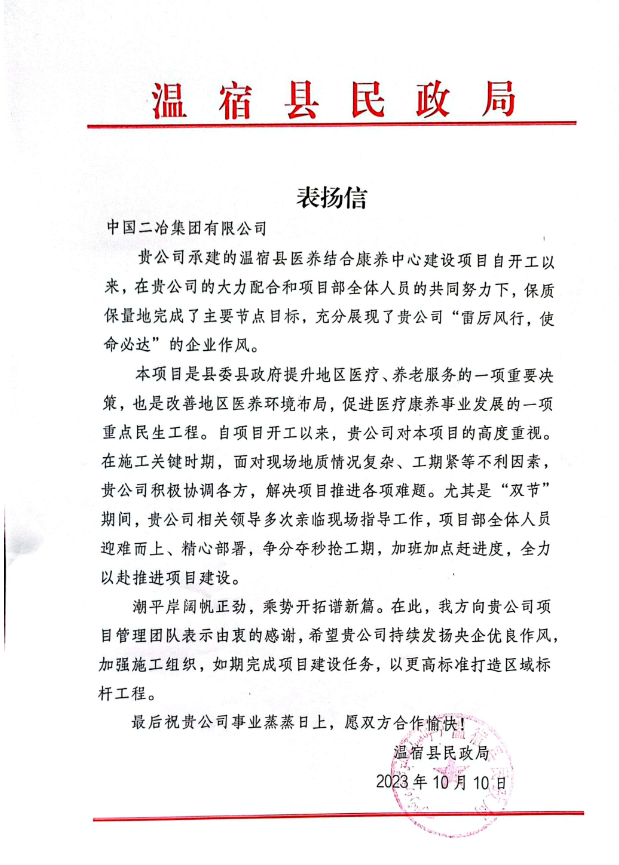 表扬信指出,温宿项目是县委县政府提升地区医疗、养老服务的一项重要决策,也是改善地区医养环境布局,促进医疗康养事业发展的一项重点民生工程。自项目开工以来,面对现场地质情况复杂、工期紧等不利因素,温宿项目部积极协调各方,解决项目推进各项难题。尤其是“双节”期间,相关领导多次亲临现场指导工作,项目部全体人员迎难而上、精心部署,争分夺秒抢工期,加班加点赶进度,全力以赴推进项目建设。同时,在中国二冶的大力配合和项目部全体人员的共同努力下,保质保量地完成了主要节点目标,充分展现了中国二冶“雷厉风行,使命必达”的企业作风。