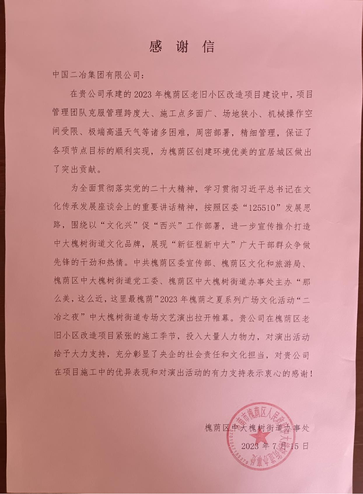 槐荫中大槐树街道感谢信中指出,自槐荫老旧小区项目开工以来面对工期紧张、施工条件复杂等诸多不利因素,项目管理团队克服管理跨度大、施工点多面广、场地狭小、机械操作空间受限、极端高温天气等诸多困难,周密部署,精细管理,保证了各项节点目标的顺利实现,极大的加快了施工进度,充分体现了央企的责任心和服务意识。信中表示,中国二冶在紧张的项目施工中,投入大量人力物力,对 2023 年槐荫之夏系列广场文化活动“二冶之夜”中大槐树街道专场文艺演出活动给予了大力支持,充分彰显了央企的文化担当。
