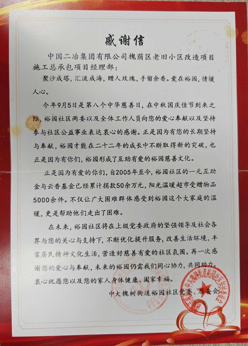 裕园社区党委、居委会感谢信中表示中国二冶积极投身慈善公益事业,充分展现了央企的社会责任担当,裕园社区党委、居委会向中国二冶的爱心奉献以及坚持参与社区公益事业表达衷心的感谢。