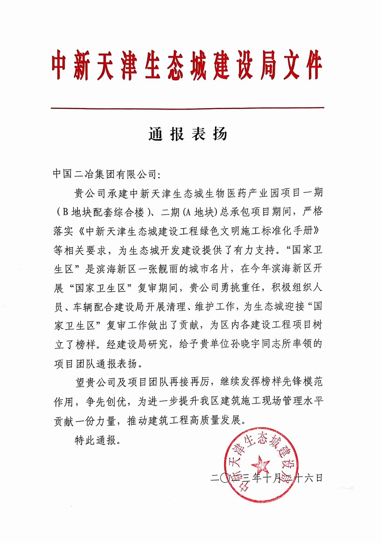 11月6日,中国二冶中新天津生态城生物医药产业园项目收到中新天津生态城建设局表扬信。