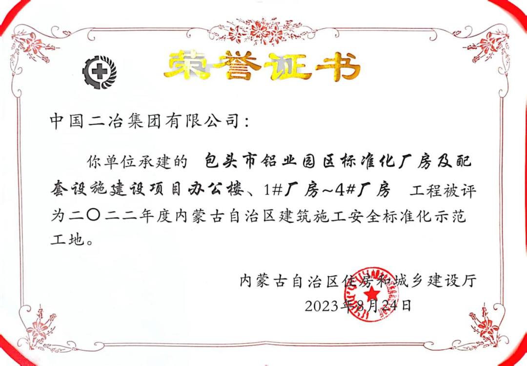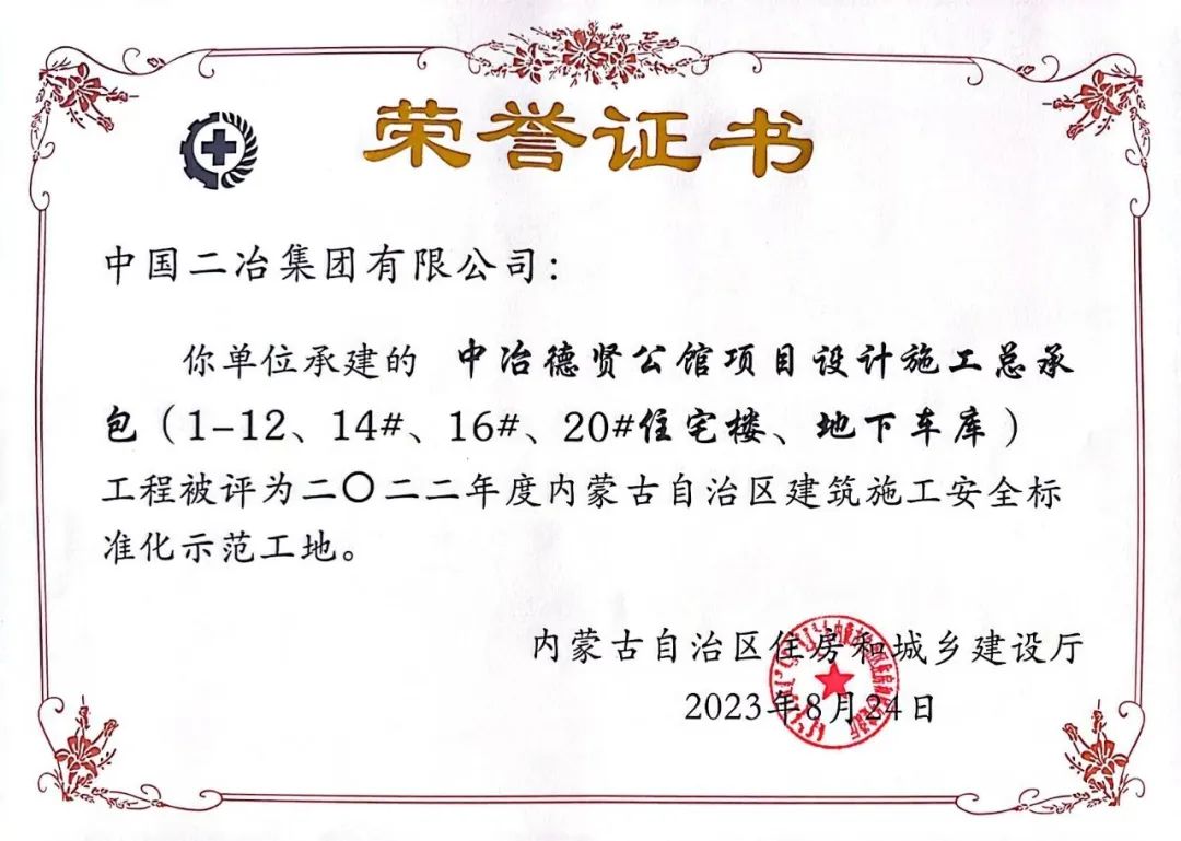 11月13日,中国二冶收到内蒙古自治区住房和城乡建设厅荣誉证书,中国二冶中冶德贤公馆项目、包头市铝业园区标准化厂房及配套基础设施建设项目荣获“2022年度内蒙古自治区建筑施工安全标准化示范工地”荣誉称号。