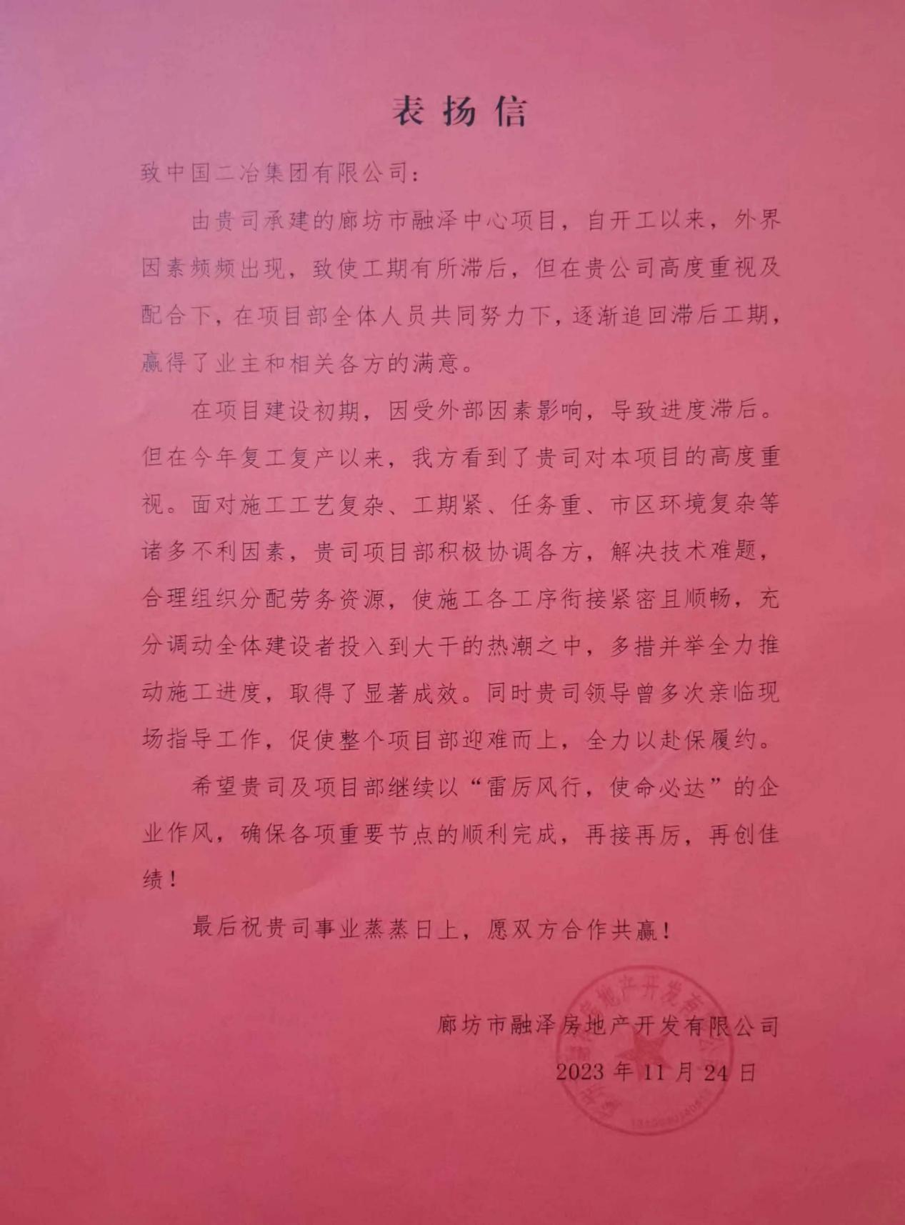 11月24日,中国二冶收到廊坊市融泽房地产开发有限公司表扬信。