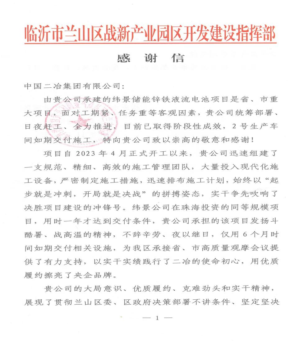 11月28日,中国二冶临沂兰城纬景储能锌铁液流电池生产项目收到临沂市兰山区战新产业园区开发建设指挥部表扬信,对该项目在工程建设任务中表现出的高效施工、优质履约、规范化管理表示高度赞扬。