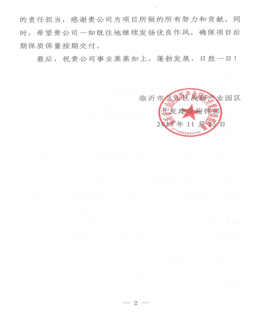 信中指出,自项目开工以来,中国二冶市政分公司迅速组建了一支规范、精细、高效的施工管理团队,大量投入现代化施工设备,制定严密的施工措施,迅速排布施工计划,以“起步就是冲刺,开局就是决战”的拼搏姿态实干争先,吹响决胜项目建设的冲锋号。该项目团队发扬“斗酷暑、战高温”的精神,不辞辛劳、夜以继日,仅用6个月时间如期交付相关设施,为兰山区承接省、市高质量观摩会议提供了有力支持,以实干实绩践行了央企的使命初心,用优质履约擦亮央企品牌。