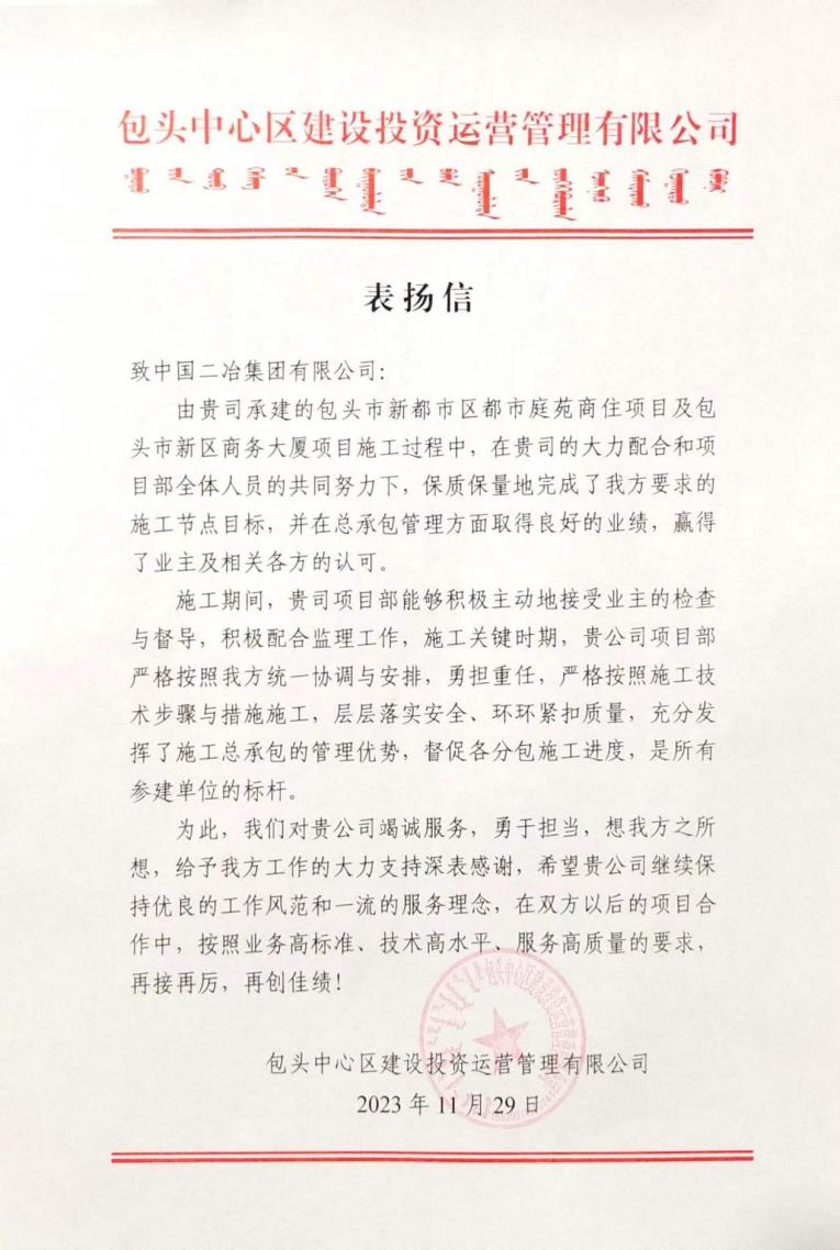11月29日,中国二冶收到包头中心区建设投资运营管理有限公司表扬信,对城建分公司新都市区都市庭苑项目及包头市新区商务大厦项目施工过程中,大力配合,精诚团结,保质保量完成了项目施工节点目标,取得良好的业绩,给予表扬,盛赞中国二冶央企的责任与担当。