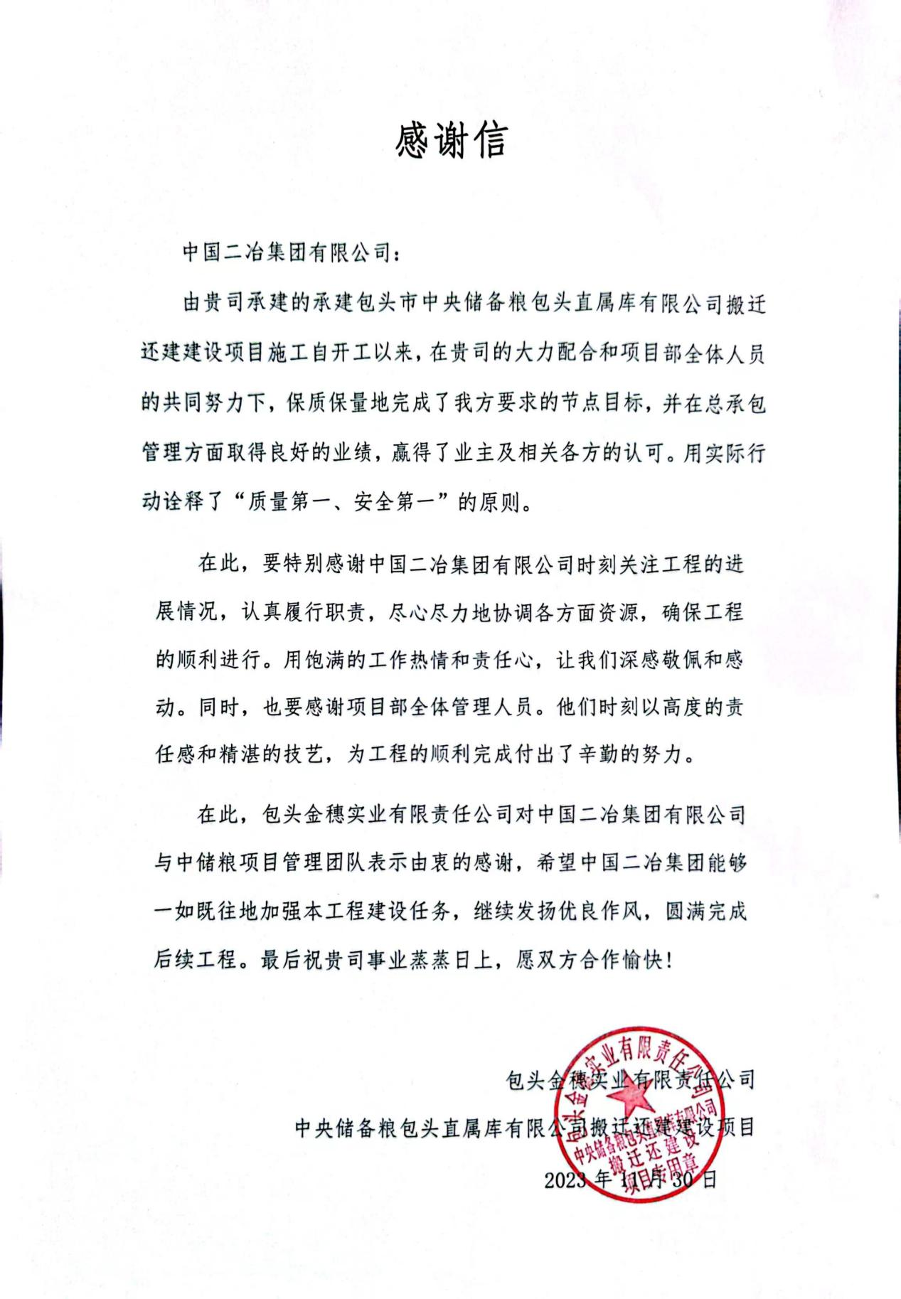 11月30日,中国二冶收到包头金穗实业有限责任公司感谢信。