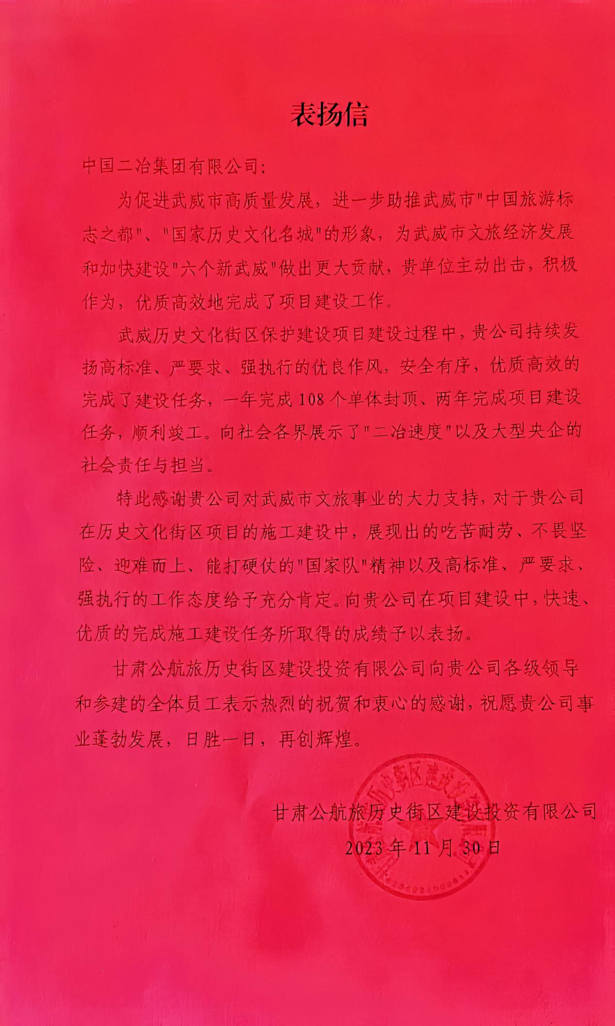 12月5日,中国二冶收到甘肃公航历史街区建设投资有限公司表扬信。