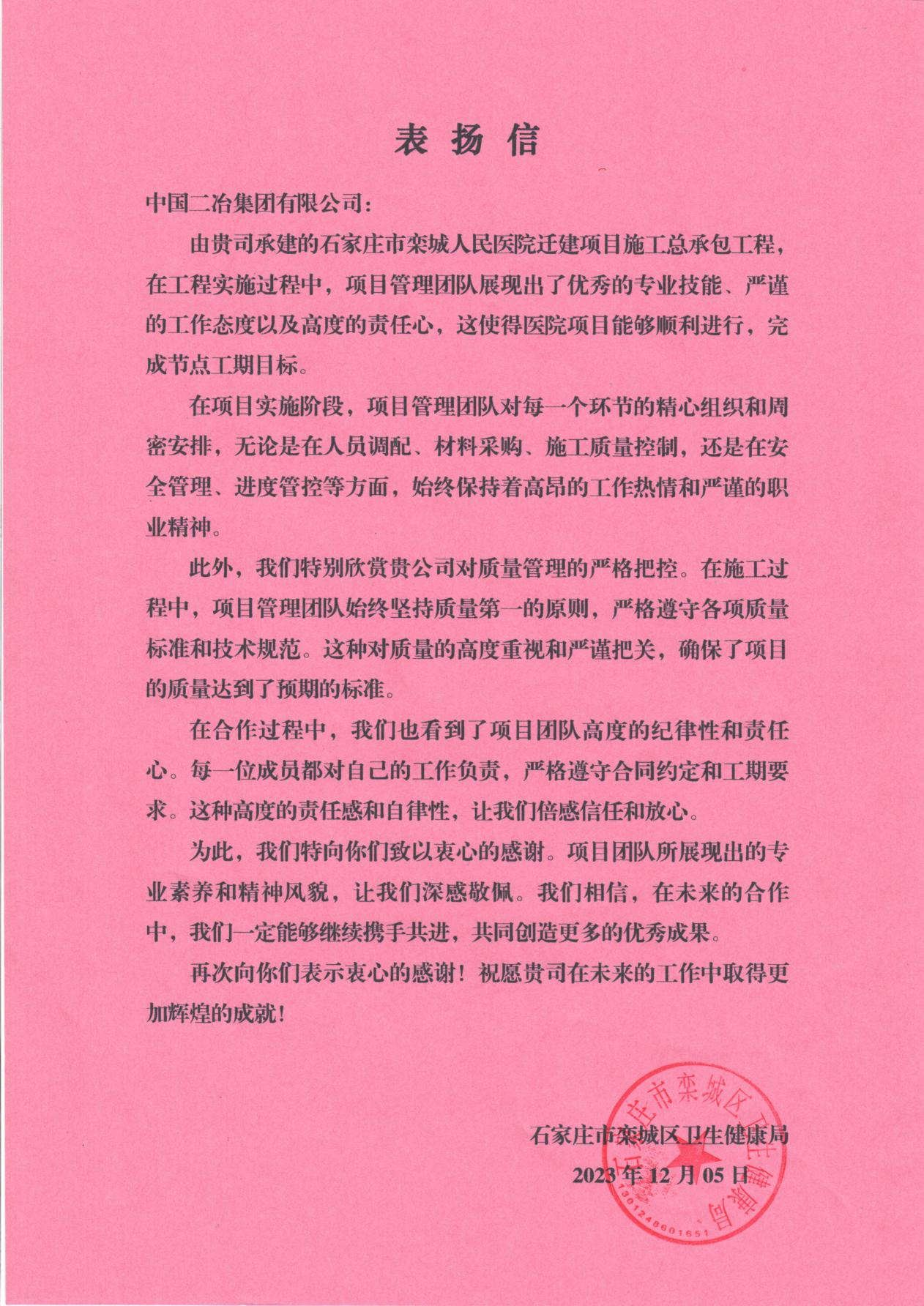 12月7日,中国二冶收到石家庄市栾城区卫生健康局表扬信。信中赞扬石家庄市栾城人民医院迁建项目总承包工程在建设过程中,攻坚克难,精细部署,有序推进,以实际行动充分体现了二冶人的实干担当。