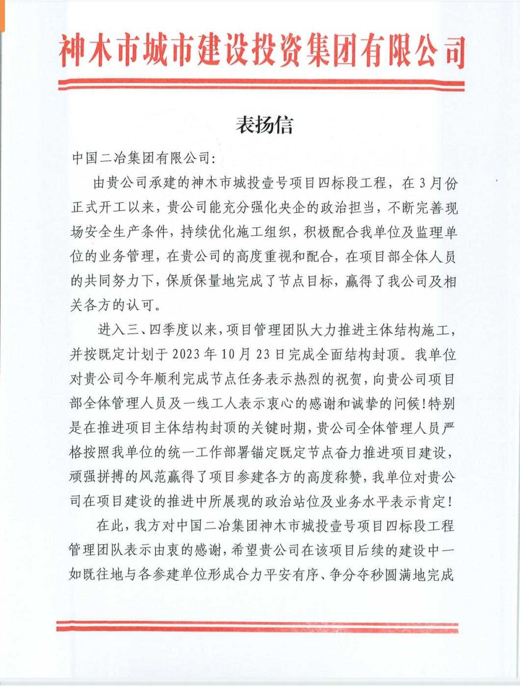 12月8日,中国二冶收到神木市城市建设投资集团有限公司表扬信,对由中国二冶承建的神木市城投壹号项目保质保量完成节点目标表示赞扬。