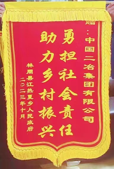 12月11日,中国二冶收到林周县江热夏乡人民政府赠送的“勇担社会责任,助力乡村振兴”锦旗,对中国二冶积极助力乡村发展表示感谢与赞扬。