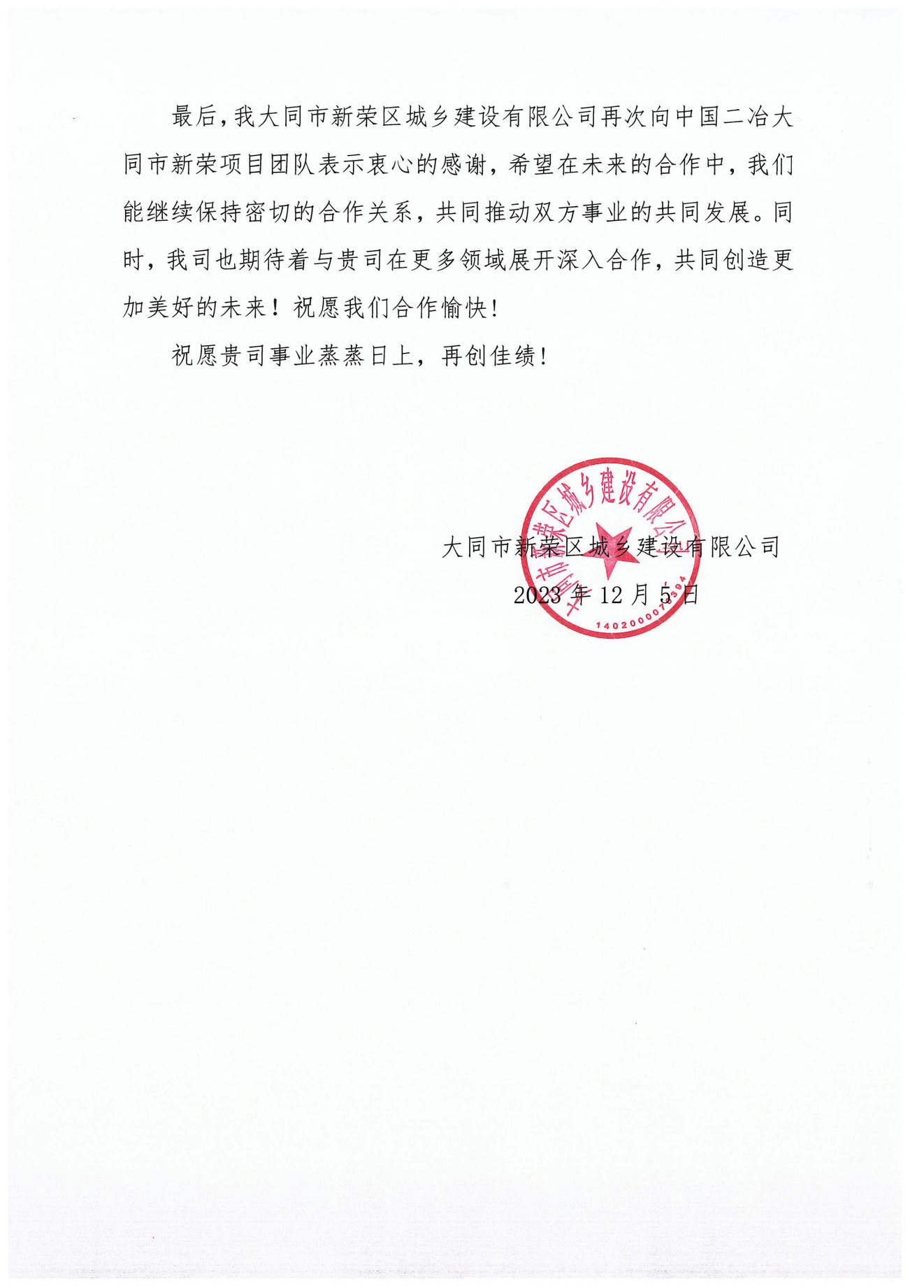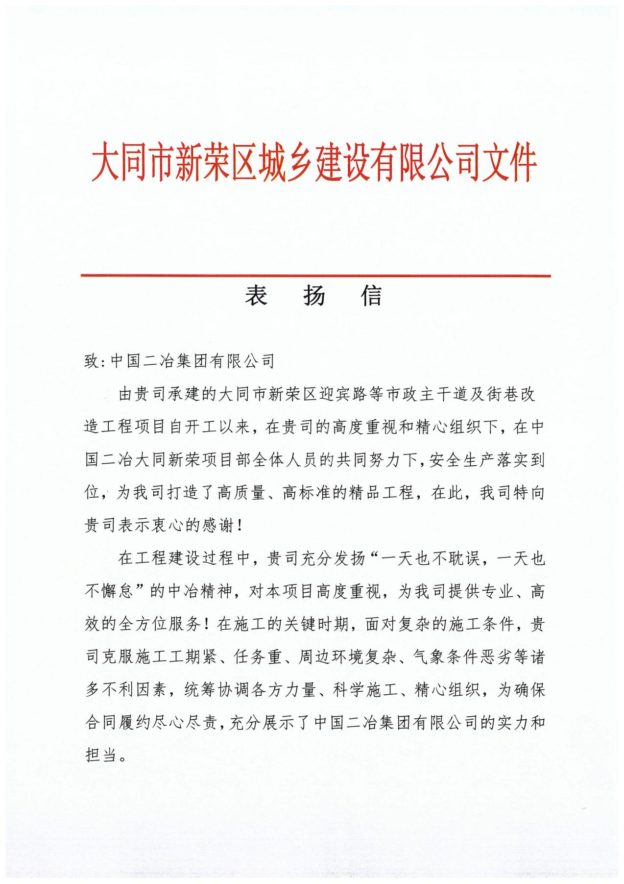 12月11日,中国二冶收到大同市新荣区城乡建设有限公司表扬信,对中国二冶在山西大同新荣区迎宾路等市政主干道及街巷改造建设任务中的突出贡献表示高度赞扬。