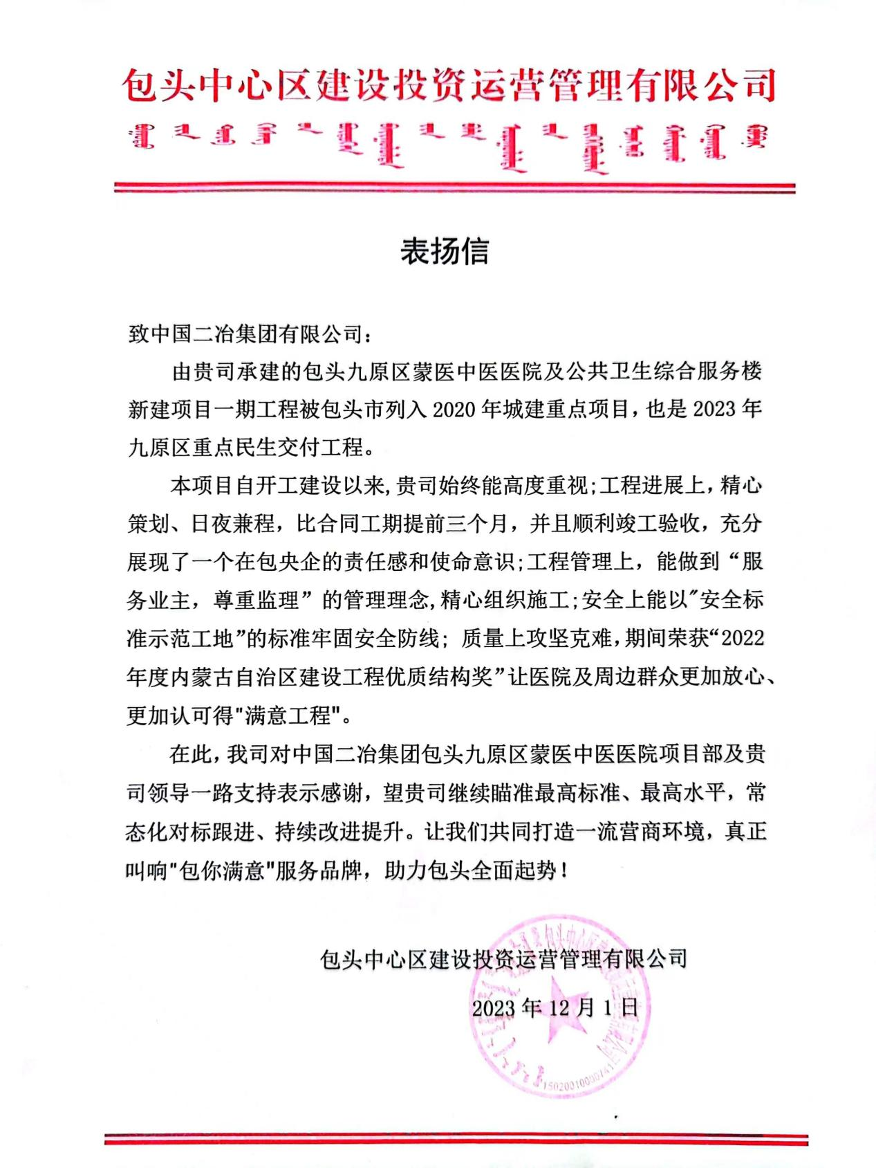 中国二冶承建的包头市九原医院项目在工程交付并投入使用后,收到来自包头中心区建设投资运营管理有限公司的表扬信。信中对九原医院项目团队在项目建设中面临诸多困难却迎难而上,全力以赴推进工程建设,不仅提前完成工期节点目标而且还荣获2022年度内蒙古自治区建设工程优质结构杯、2023年度内蒙古自治区QC竞赛二等奖,信中对该项目团队在建设过程中展现的二冶人风采给予高度肯定,并对最终实现顺利交付表示感谢。