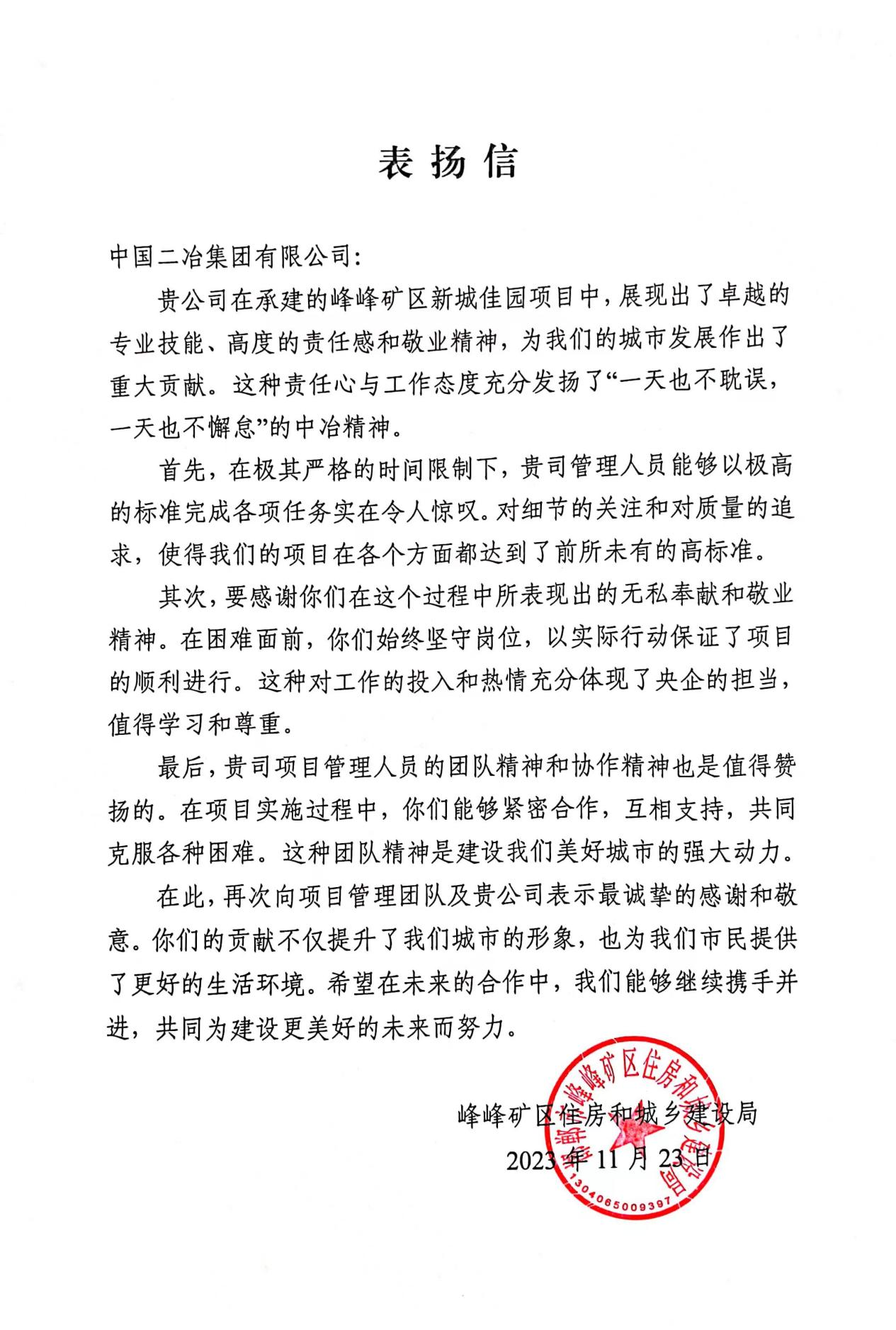 在邯郸市峰峰矿区住房和城乡建设局发来的表扬信中提到,中国二冶峰峰矿区新城佳园项目团队高标准、高效率完成工期节点目标,对该项目团队在提升城市形象,为市民提供更好的生活环境所作出的努力表示感谢。信中表示,中国二冶作为一家有着良好合作精神的央企,期待在未来与更多优秀的合作伙伴携手共进。