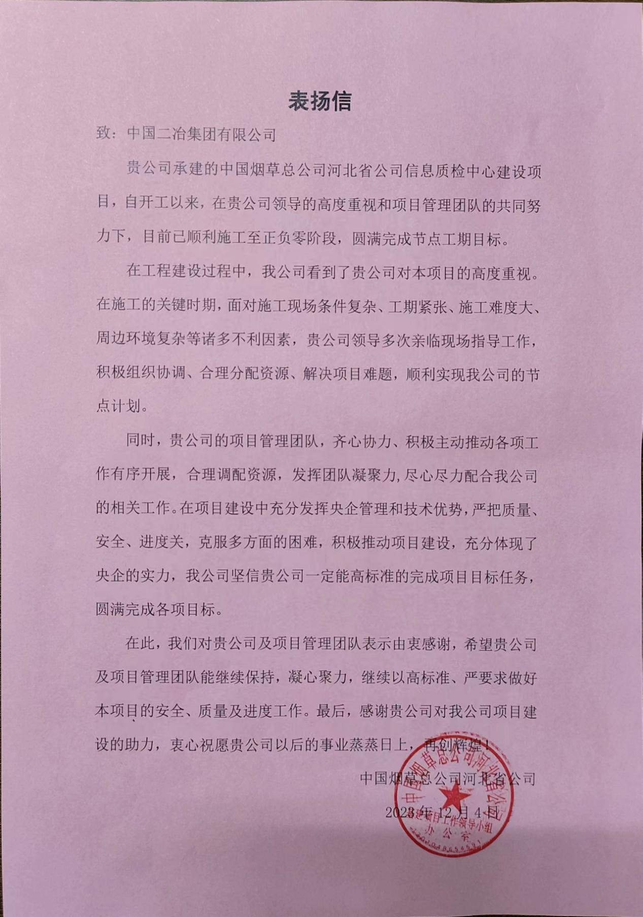 中国烟草总公司河北省公司表扬信中对石家庄烟草项目管理团队在施工过程中严格抓好质量、进度、安全关,克服多方面的困难,积极推动项目建设的高度认可。