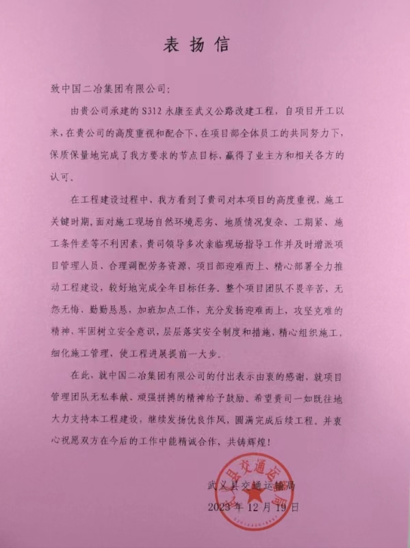 12月19日,中国二冶收到武义县交通运输局表扬信,对S312永康至武义公路改建工程项目部2023年安全管控、施工管理、工程进度、环境保护等方面的工作给予充分肯定。