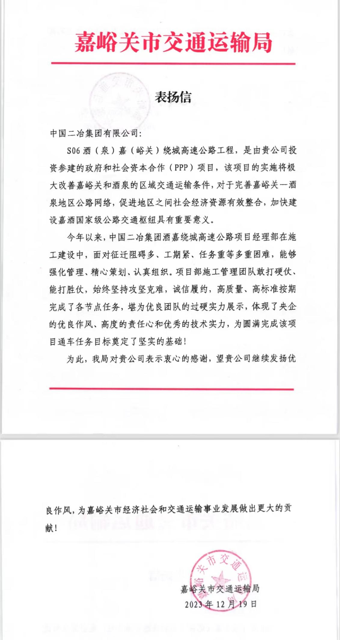 嘉峪关市交通运输局在表扬信中指出,今年以来,中国二冶酒嘉绕城高速公路项目经理部在施工建设中,面对工期紧、任务重等多重困难,能够强化管理、精心策划、认真组织。酒嘉项目部施工管理团队敢打硬仗、能打胜仗,始终坚持攻坚克难,诚信履约,高质量、高标准按期完成了各节点任务,堪为优良团队的过硬实力展示,体现了央企的优良作风、高度的责任心和优秀的技术实力,为圆满完成该项目通车任务目标奠定了坚实的基础!