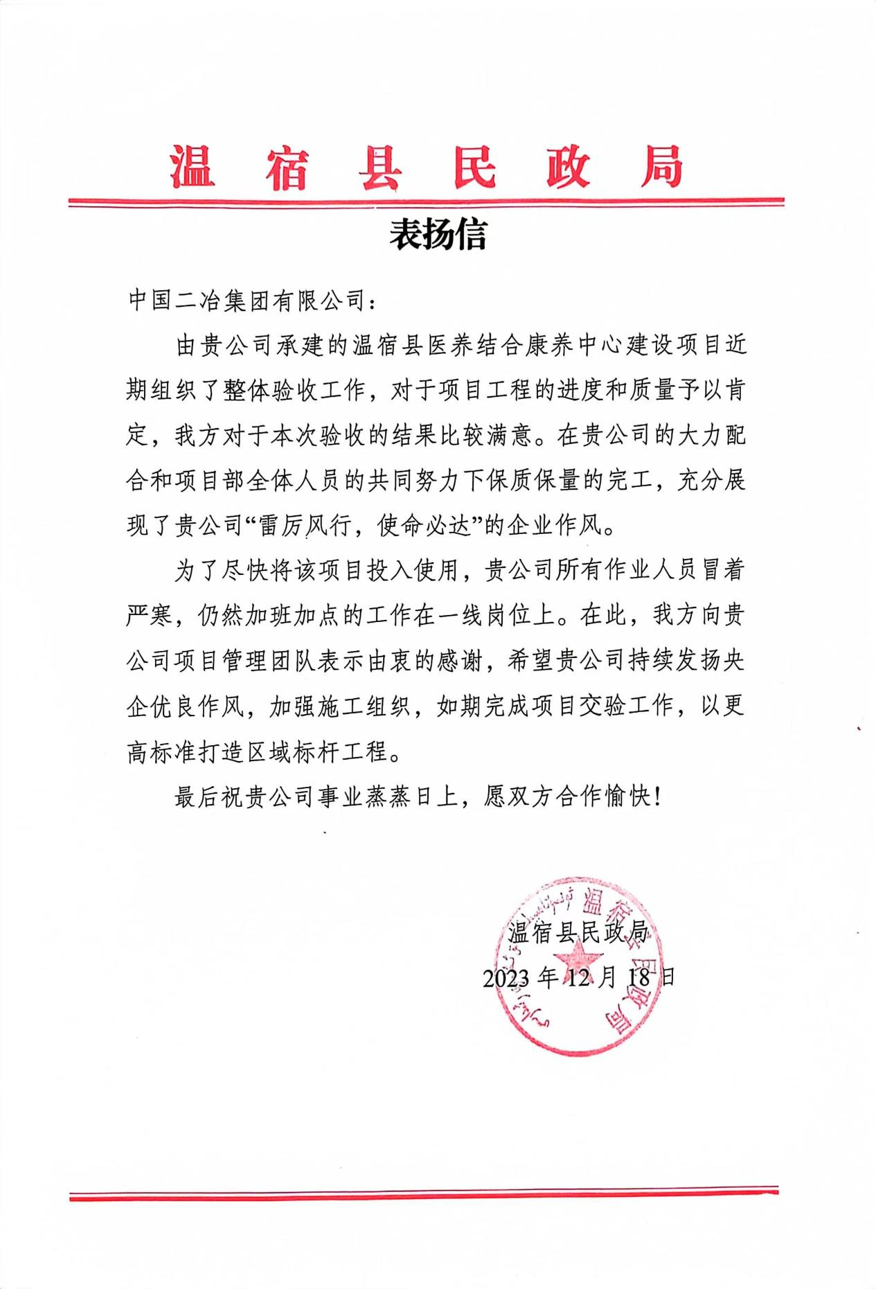 温宿县民政局在表扬信中指出,由中国二冶承建的温宿县医养结合康养中心建设项目近期组织了整体验收工作,对于项目工程的进度和质量予以肯定。在中国二冶的大力配合和温宿项目部全体人员的共同努力下保质保量的完工,充分展现了中国二冶的“雷厉风行,使命必达”的企业作风。