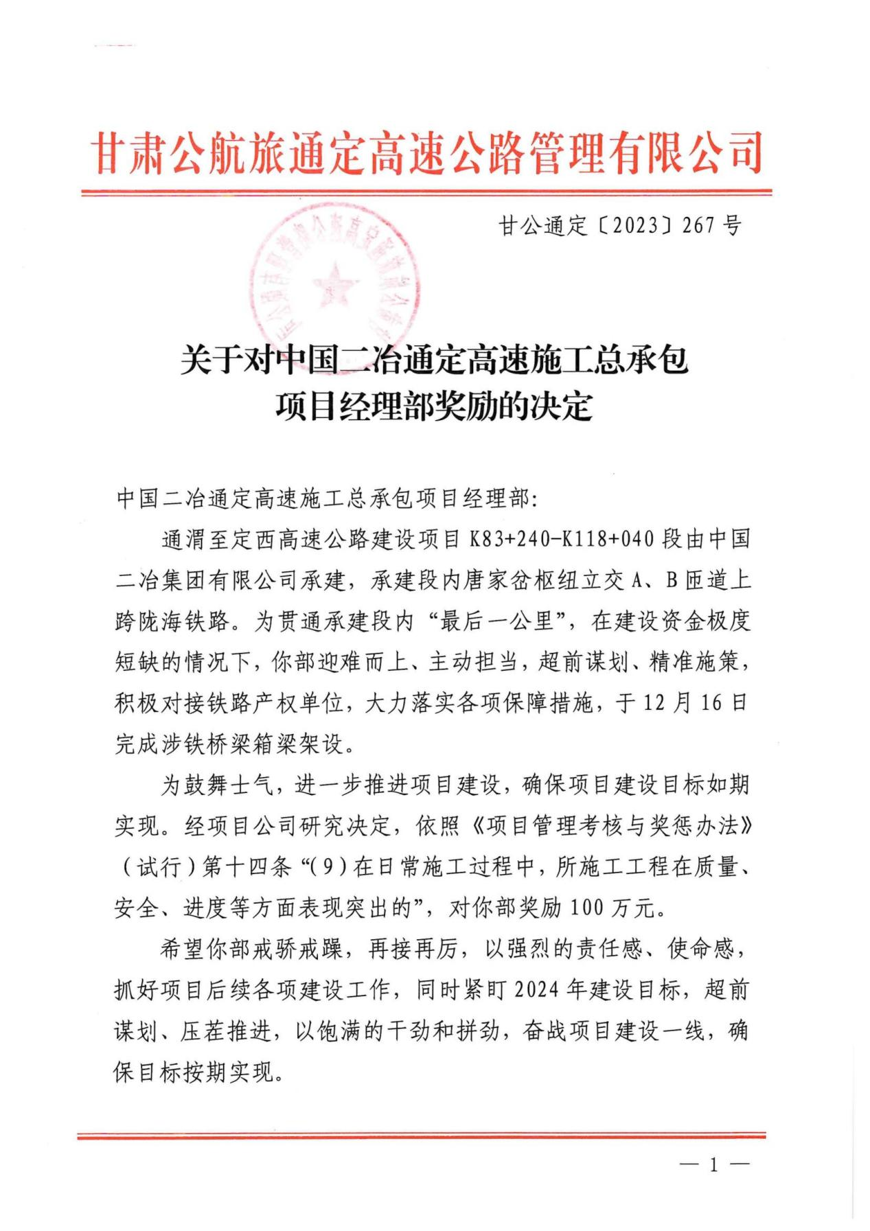 决定中指出,通定项目部在建设资金极度短缺的情况下,迎难而上、主动担当,克服了重重困难,高效优质地完成了涉铁桥梁箱梁架设任务,于12月16日如期实现了唐家岔枢纽立交A、B匝道高架桥梁合龙贯通。对于此次项目建设的重大突破,甘肃公航旅决定给予项目部100万元奖励,希望项目部再接再厉,抓好项目后续各项建设工作,紧盯2024年建设目标,确保目标按期实现。
