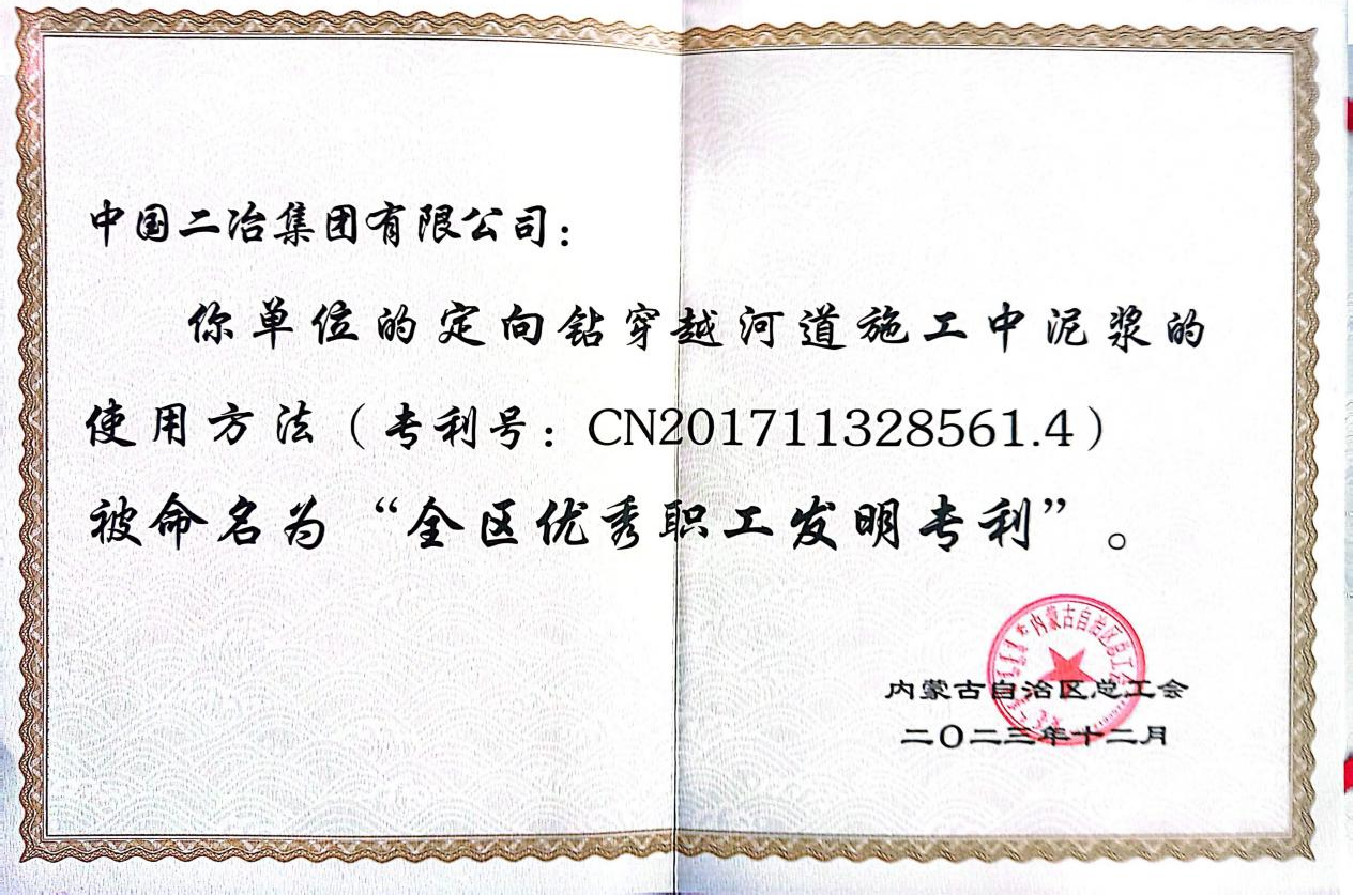 12月23日,自治区总工会、自治区党委宣传部、自治区科学技术厅、自治区工业和信息化厅、自治区人力资源和社会保障厅、内蒙古广播电视台在鄂尔多斯联合举行内蒙古自治区第七届北疆工匠发布会暨颁奖典礼,中国二冶申报的《定向钻穿越河道施工中泥浆的使用方法》发明专利荣获全区优秀职工发明专利。