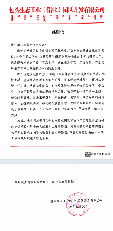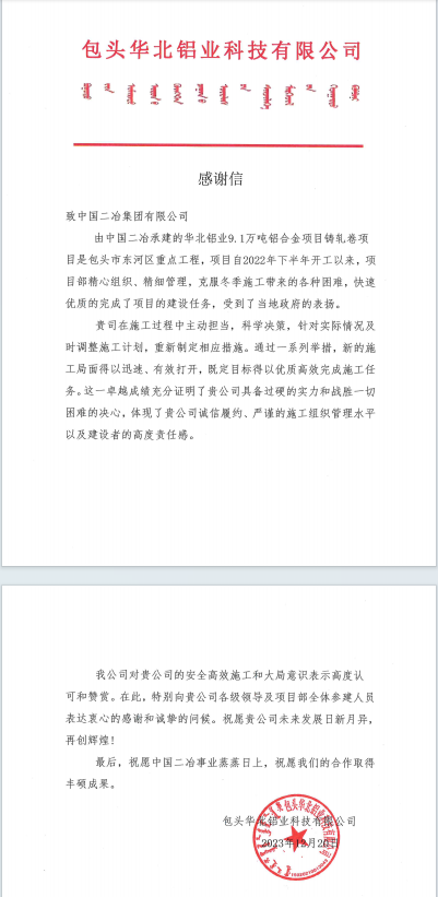 近日,中国二冶收到包头生态工业(铝业)园区开发有限公司和包头华北铝业科技有限公司感谢信。
