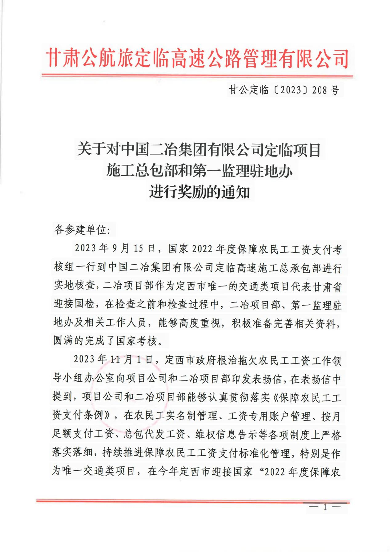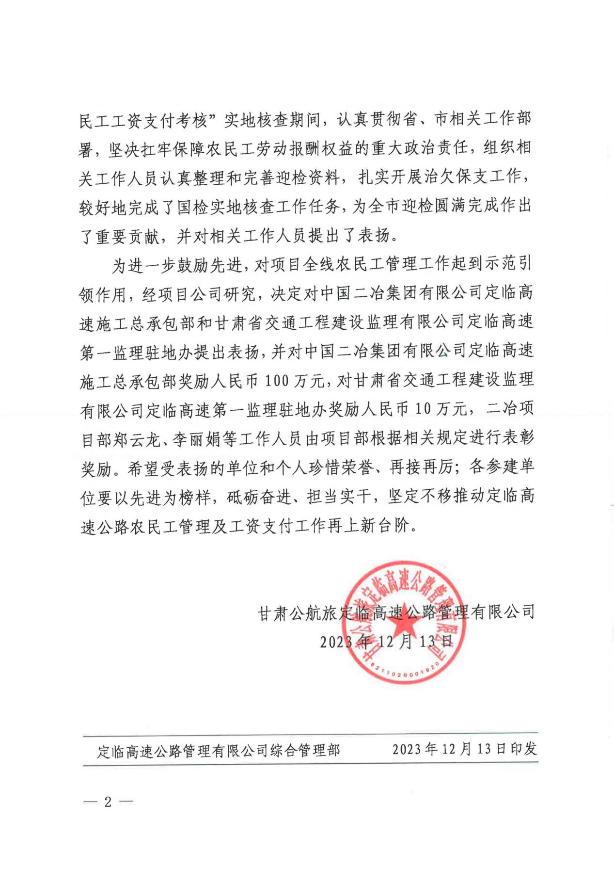 甘肃公航旅在表扬信中指出,中国二冶定临项目部作为定西市唯一的交通类项目代表甘肃省迎接国家2022年度保障农民工工资支付考核,在检查之前和检查过程中,定临项目部能够高度重视,积极准备完善相关资料,认真贯彻落实《保障农民工工资支付条例》,在农民工实名制管理、工资专用账户管理、按月足额支付工资、总包代发工资、维权信息告示等各项制度上严格落实落细,持续推进保障农民工工资支付标准化管理,圆满地完成了国家考核。对于此次突出表现,甘肃公航旅决定给予定临项目部100万元奖励,并希望项目部能够砥砺奋进、担当实干,坚定不移推动定临高速公路农民工管理及工资支付工作再上新台阶。