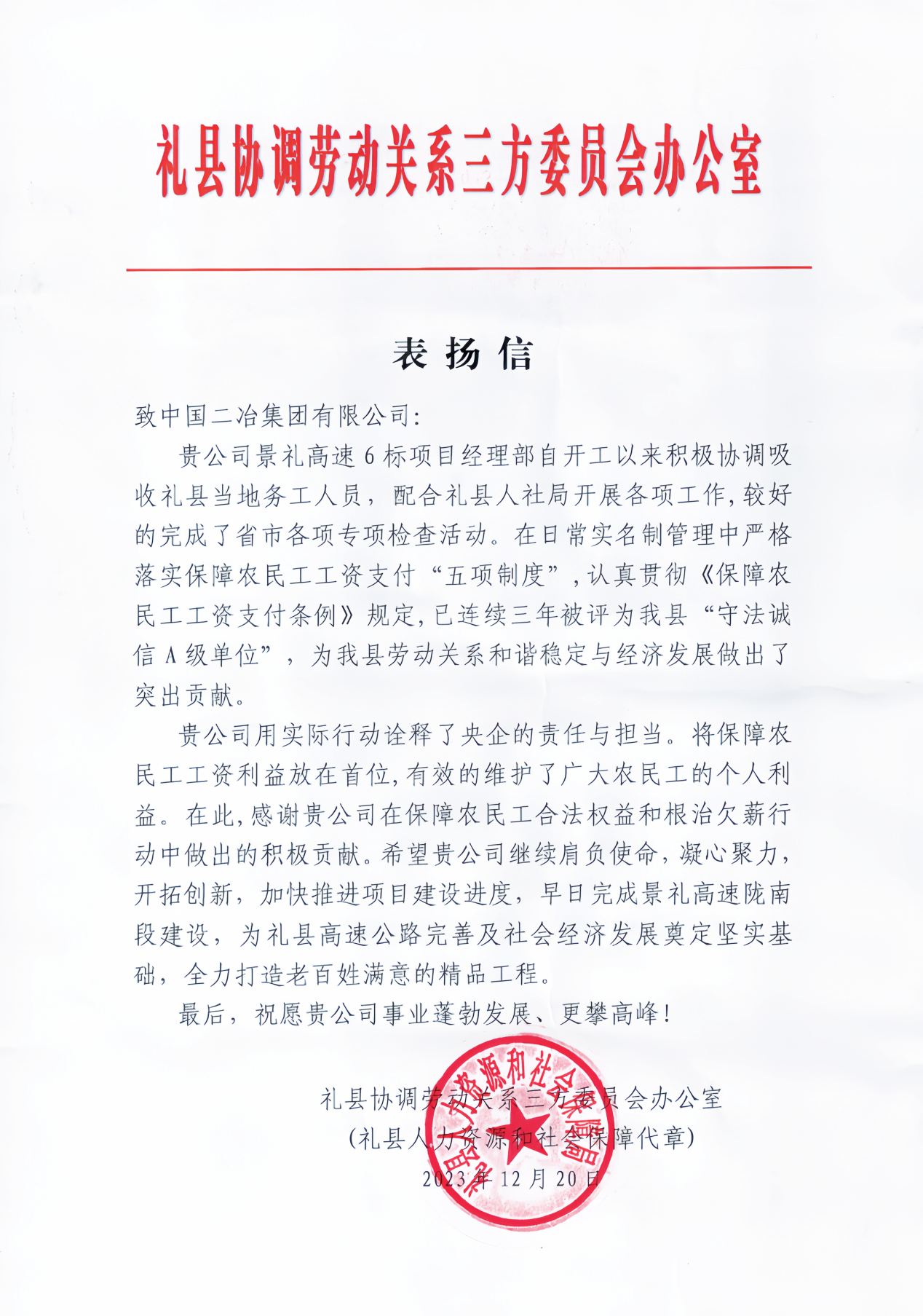 礼县协调劳动关系三方委员会办公室在表扬信中指出,中国二冶景礼项目部自开工以来积极协调吸收礼县当地务工人员,配合礼县人力资源和社会保障局开展各项工作,较好的完成了省市各项专项检查活动。在日常实名制管理中严格落实保障农民工工资支付“五项制度”,认真贯彻《保障农民工工资支付条例》规定,将保障农民工利益放在首位,有效地维护了广大农民工的个人利益,已连续三年被评为“守法诚信 A 级单位”,为礼县劳动关系和谐稳定与经济发展做出了突出贡献,用实际行动诠释了央企的责任与担当。