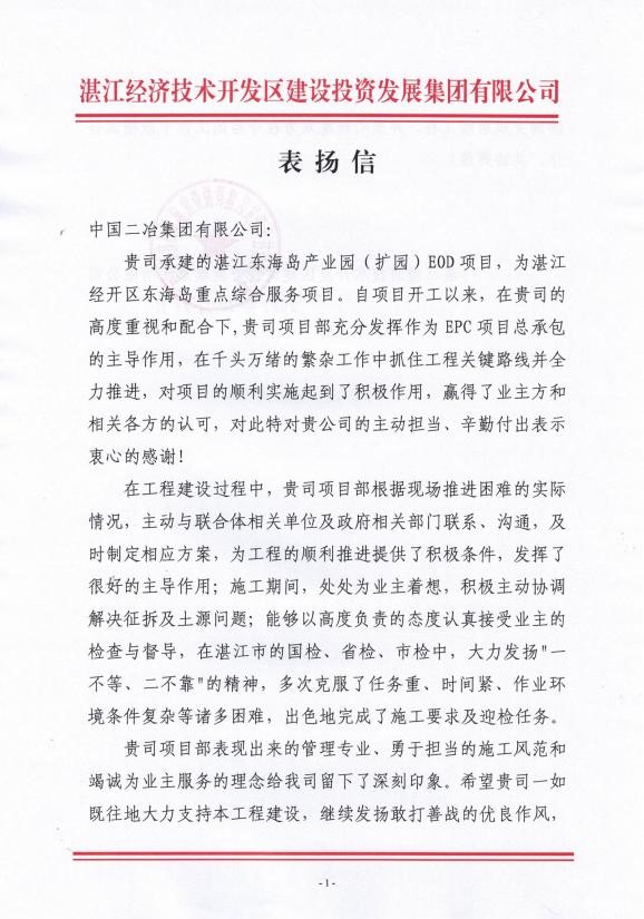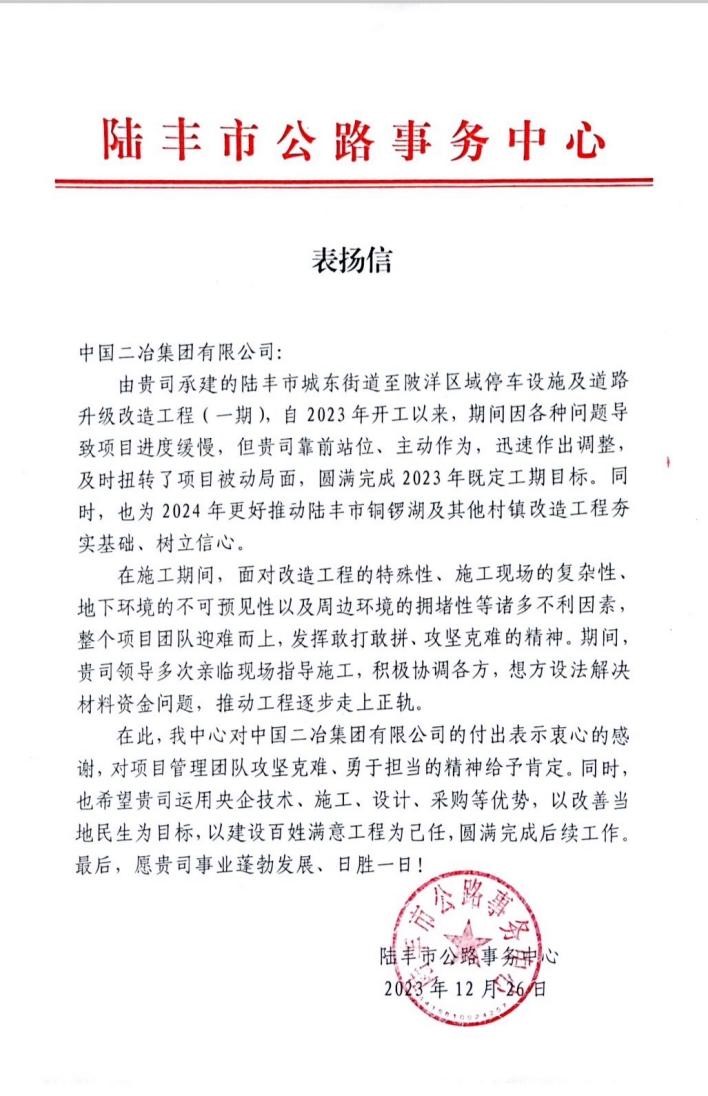 近日,中国二冶连续收到陆丰市公路事务中心、湛江经济技术开发区建设投资发展集团表扬信。