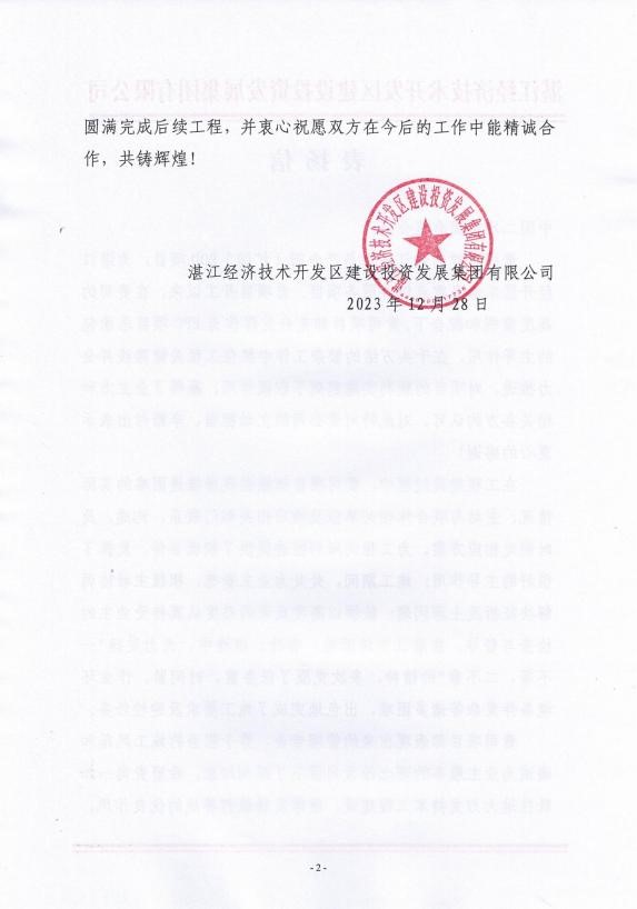 湛江经济技术开发区建设投资发展集团在信中指出,由中国二冶承建的湛江东海岛产业园(扩园)EOD项目,为湛江经开区东海岛重点综合服务项目。自开工以来,公司高度重视,项目部充分发挥作为EPC项目总承包的主导作用,在千头万绪的繁杂工作中抓住工程关键路线并全力推进,对项目的顺利实施起到了积极作用。施工期间,项目团队主动协调,及时沟通,处处为业主着想,以高度负责的态度认真接受业主的检查与督导,赢得了业主方和相关各方的认可,对此特对中国二冶的主动担当、辛勤付出表示衷心的感谢!