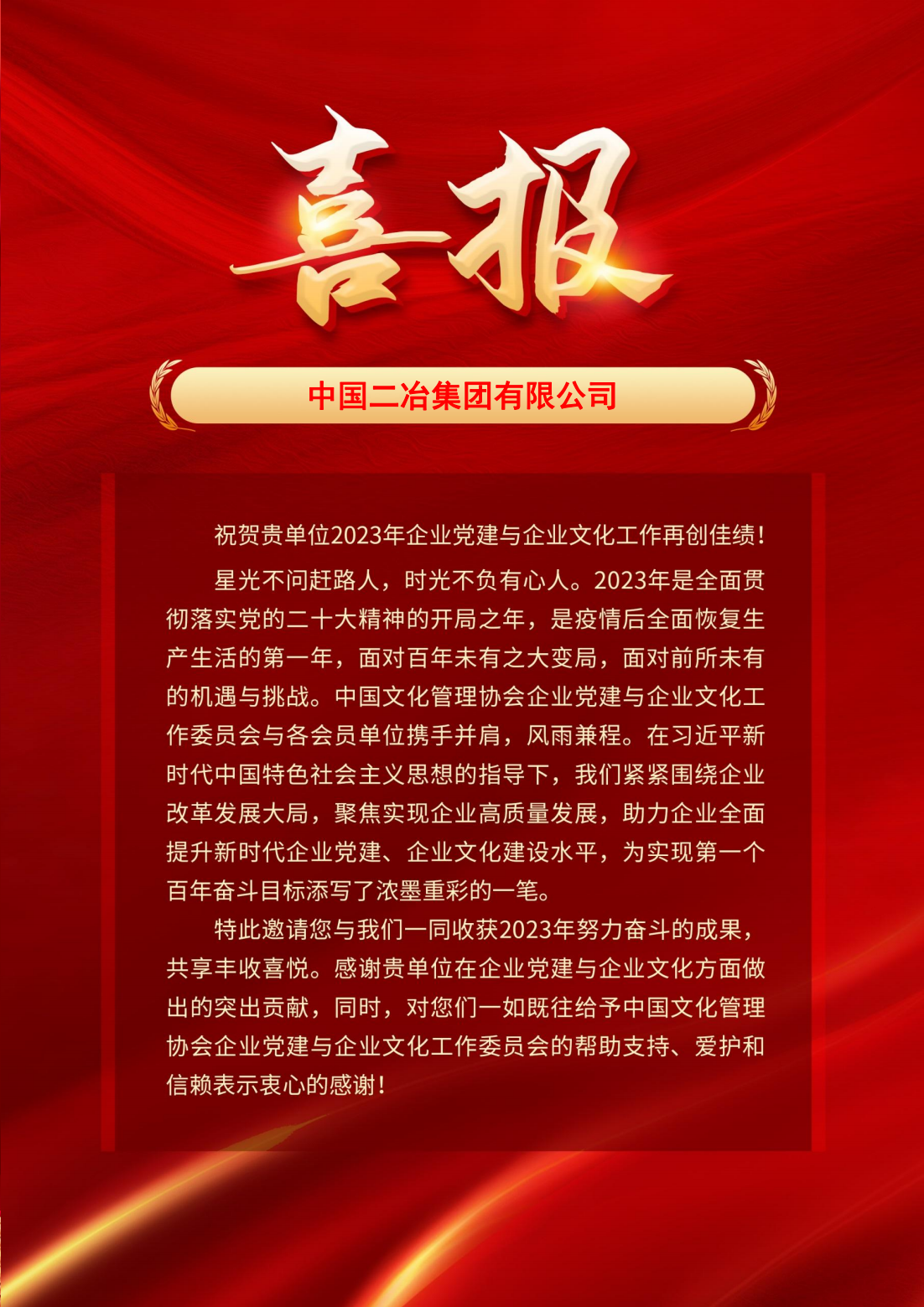 2023年,中国二冶荣获企业文化管理协会“企业党建实践创新优秀单位 ”;短视频《党啊!我想对您说》获最美企业之声银奖代言作品;企业文化案例《筑就文化底蕴凝聚奋进力量》成果入编由人民日报出版社出版发行的《奋进新征程再创新辉煌——党建引领企业高质量发展创新成果选编》;公司一人获评“企业文化实践创新典范人物 ”。