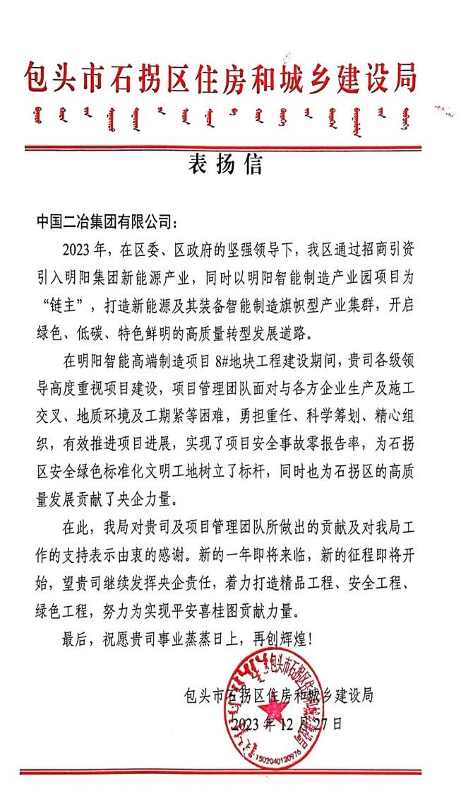 石拐住建局在信中指出,中国二冶项目团队在项目建设期间,项目管理团队科学筹划、精心组织,有效推进项目进展,实现了项目安全事故零报告率,为石拐区安全绿色标准化文明工地树立了标杆,同时也为石拐区的高质量发展贡献了央企力量。