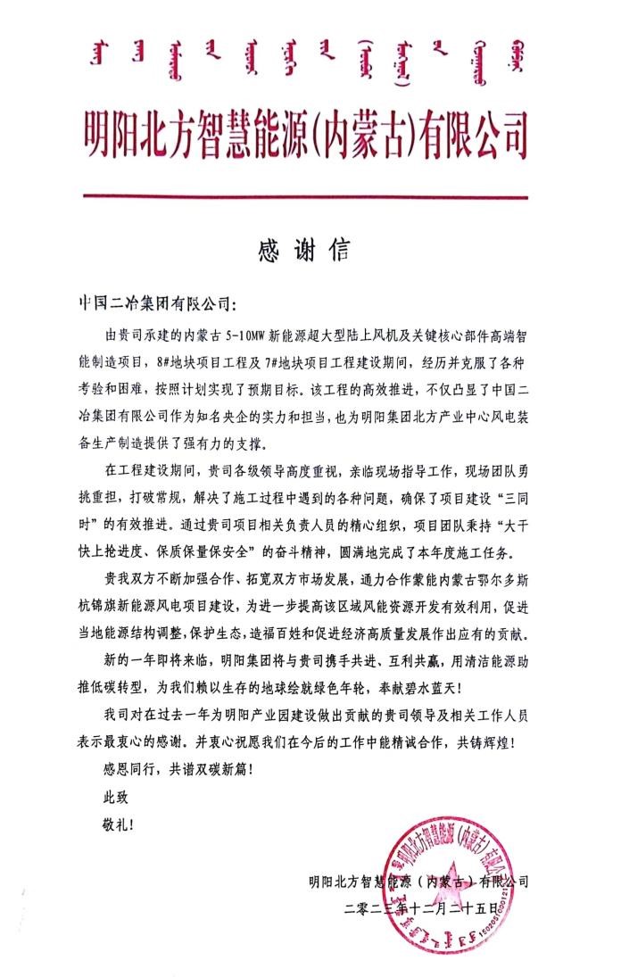 明阳智慧(内蒙古)公司在信中指出,由中国二冶承建的内蒙古5-10MW新能源超大型陆上风机及关键核心部件高端智能制造项目,经历并克服了各种考验和困难,按照计划实现了预期目标。该工程的高效推进,不仅凸显了中国二冶央企的实力和担当,也为明阳集团北方产业中心风电装备生产制造提供了强有力的支撑。