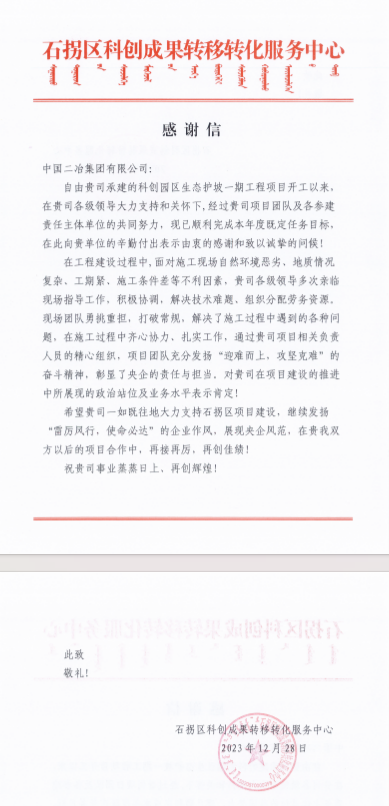 近日,包头市石拐区住房和城乡建设局、明阳北方智慧能源(内蒙古)有限公司和石拐区科创成果转移转化服务中心先后给中国二冶发来表扬信,对中国二冶在项目建设中的辛勤付出表示衷心的感谢和诚挚的问候。