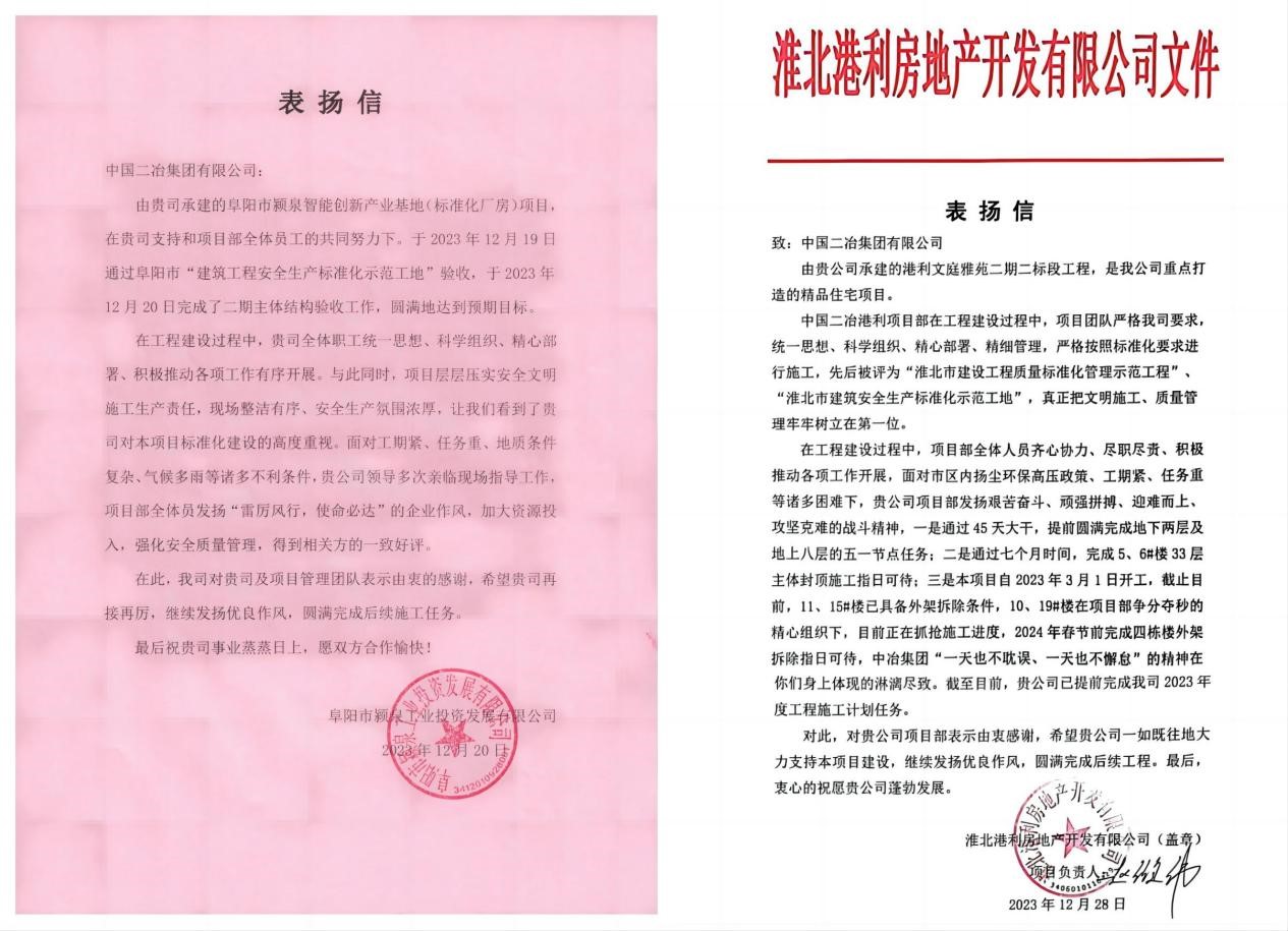 淮北港利房地产开发有限公司在表扬信中指出,中国二冶港利项目部在工程建设过程中,项目团队严格按照要求,统一思想、科学组织、精心部署、精细管理,严格按照标准化要求进行施工,先后被评为“淮北市建设工程质量标准化管理示范工程”“淮北市建筑安全生产标准化示范工地”,真正把文明施工、质量管理牢牢树立在第一位。截至目前,项目部已提前完成全年度工程施工计划任务。希望中国二冶一如既往地大力支持项目建设,继续发扬优良作风,圆满完成后续工程。