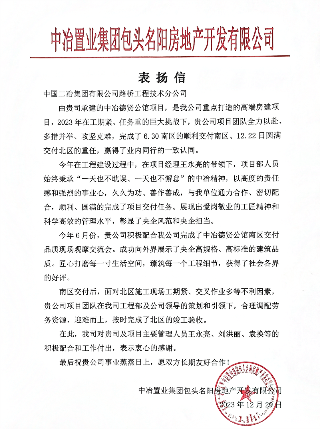 信中写道,2023年6月30日,中冶德贤公馆项目南区按期完成交付,包头市住建局、市综合执法大队组织全市各施工企业在中冶德贤公馆项目交付期间举行品质现场观摩交流会,获得各参观单位的一致好评!南区交付完成后,北区10-21#楼于2023年7月10日主体结构全部封顶,在冬季来临前,有效作业时间仅剩110天,项目部铆足干劲,结合工程实际,紧扣节点、倒排工期,按天细化工作量,做到当日事、当日毕,保质保量地于12月22日提前完成了交付,彰显了央企风范和央企担当。