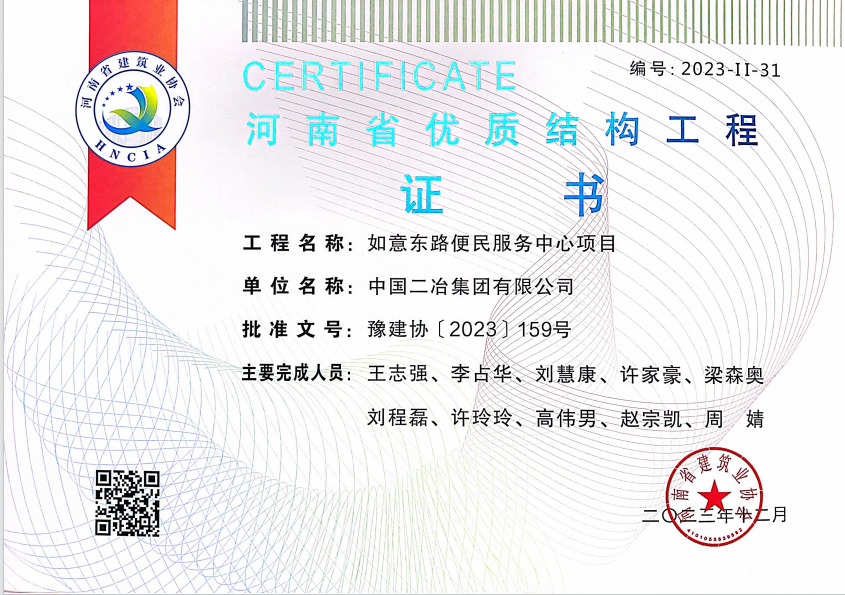 项目自开工以来,便民服务中心项目部全体参建人员坚持“高质量、高标准、高要求”,精心策划、周密部署,及时制定创优计划及实施方案,做实质量精细化管控,全面推进质量体系管理标准化、质量过程管理标准化和施工工艺流程标准化,不断强化项目施工现场管理。此次获“河南省优质结构工程”,不仅是对项目部全体人员工作的肯定,也代表着行业及社会对中国二冶履约能力、建造品质、精细化管理的充分认可。下一步项目部将持续推进创优创奖工作,强化质量意识和品牌意识,营造争先创优创奖的浓厚氛围,打造良好的品牌形象。