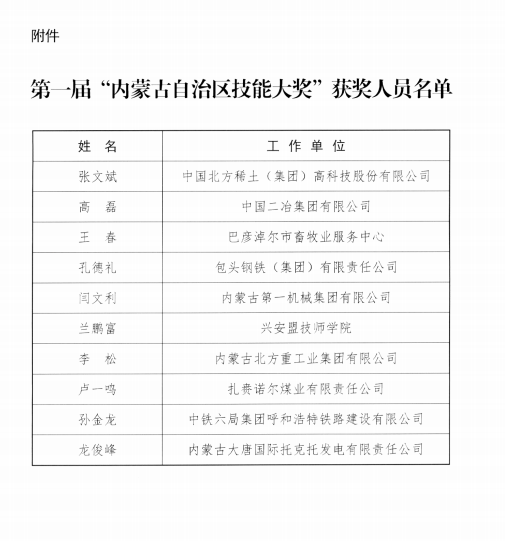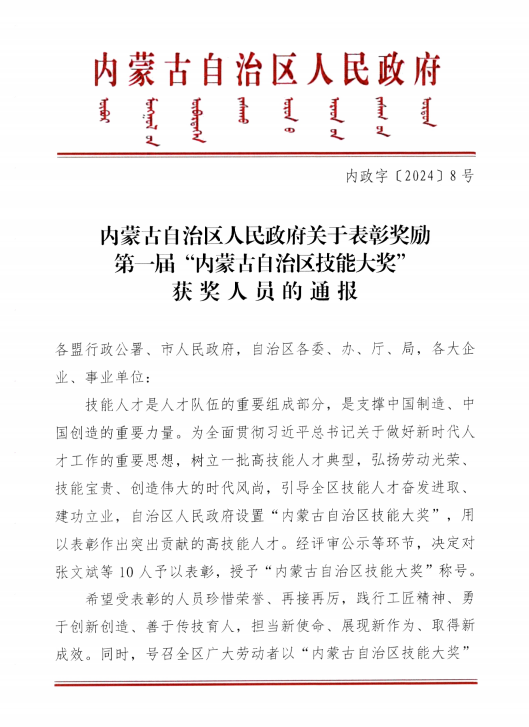 此次评选经自治区人力资源社会保障厅组织专家评审委员会进行评审,由自治区人民政府研究确定10名“内蒙古自治区技能大奖”表彰奖励人选,内蒙古自治区人民政府发文表彰。